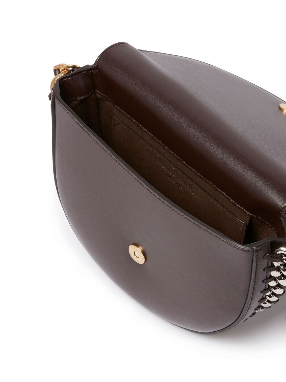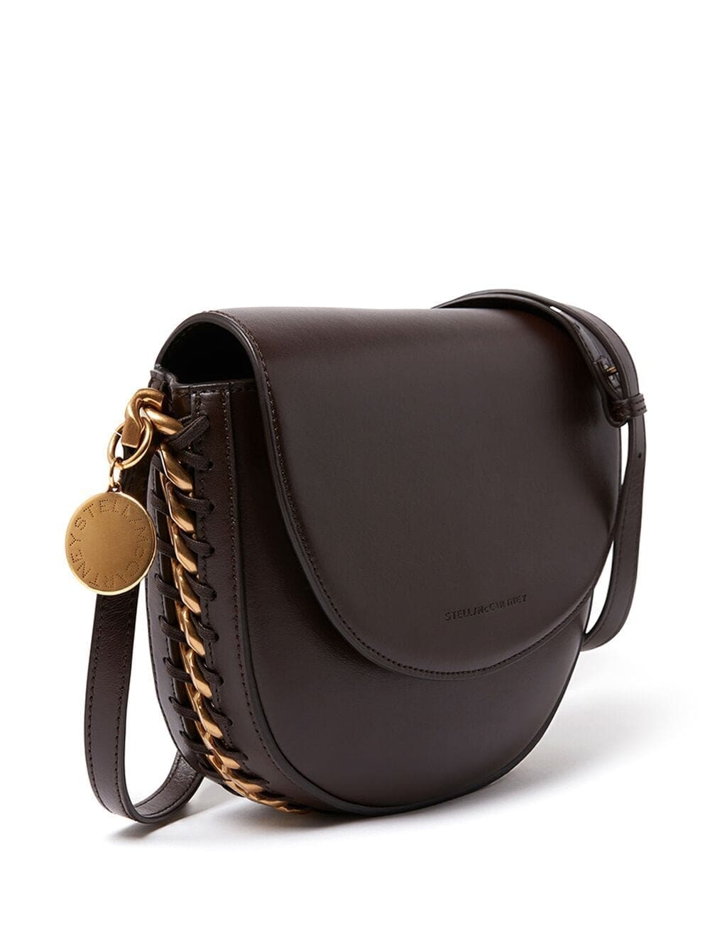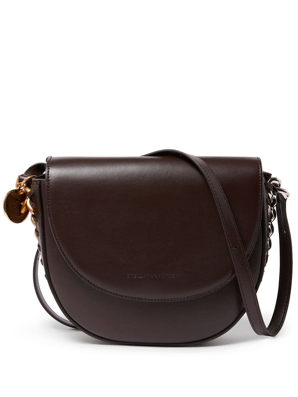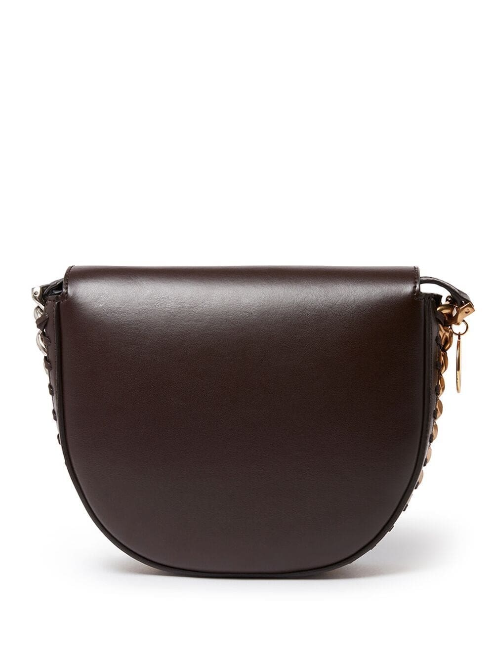 Rendered in a chocolate brown hue, Stella McCartney's Frayme silhouette boasts two-tone metalling trimming around its curved-edge body. Italy-made, the accessory is emblazoned with a signature logo charm at the side.