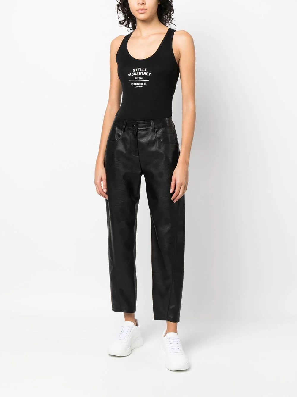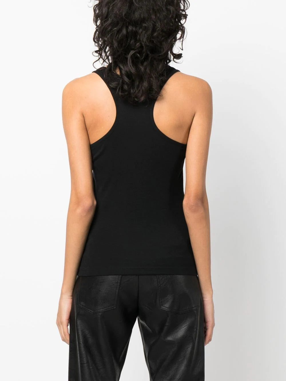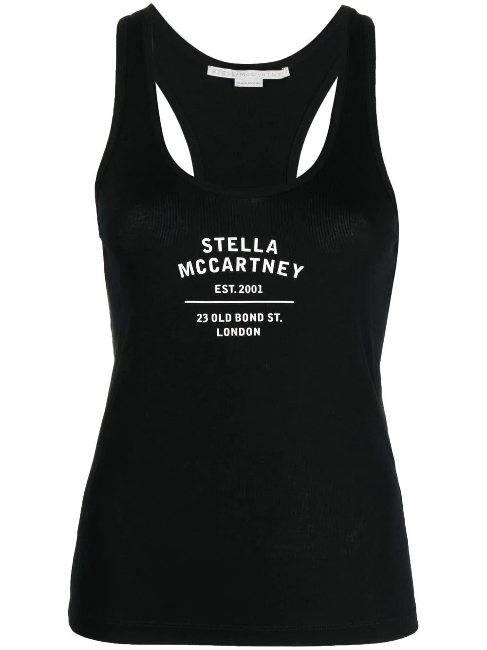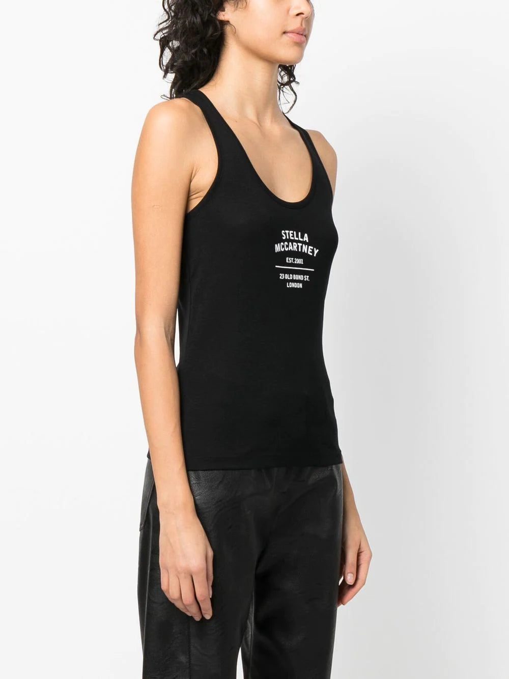 logo-print racerback vest top from STELLA MCCARTNEY featuring black/white, cotton-lyocell blend, jersey knit, logo print to the front, scoop neck, racerback, sleeveless and straight hem. Conscious: This item contains at least 50% low-impact materials, which are certified or widely recognised as having a lower environmental impact..