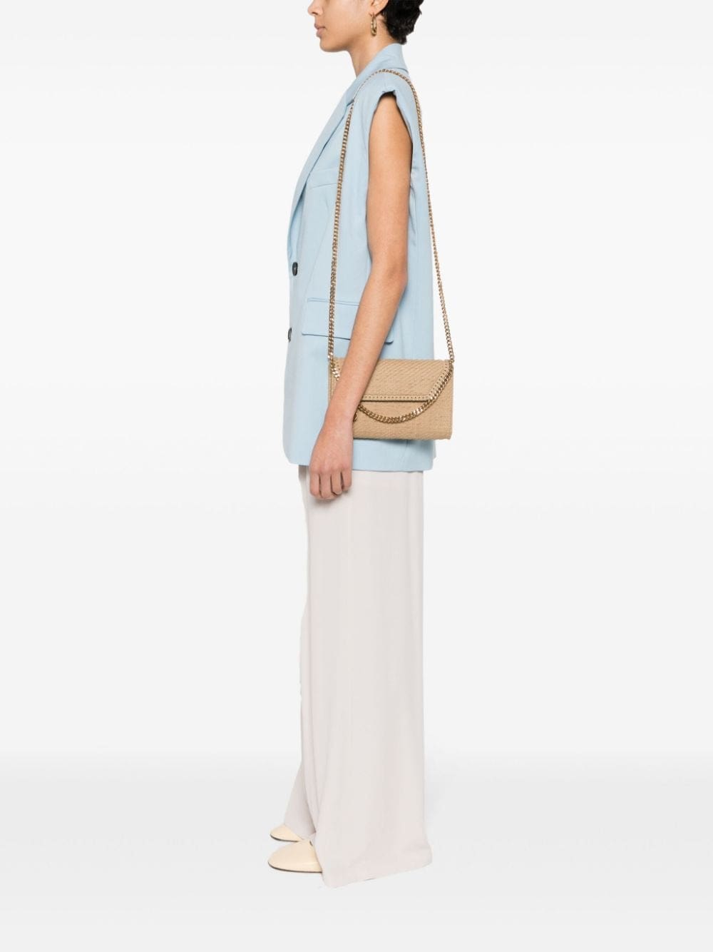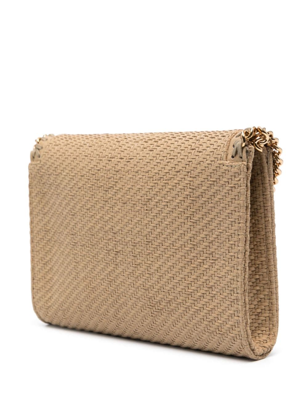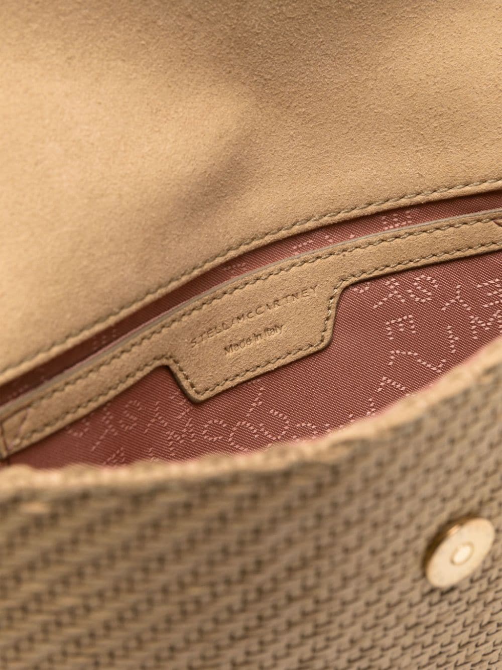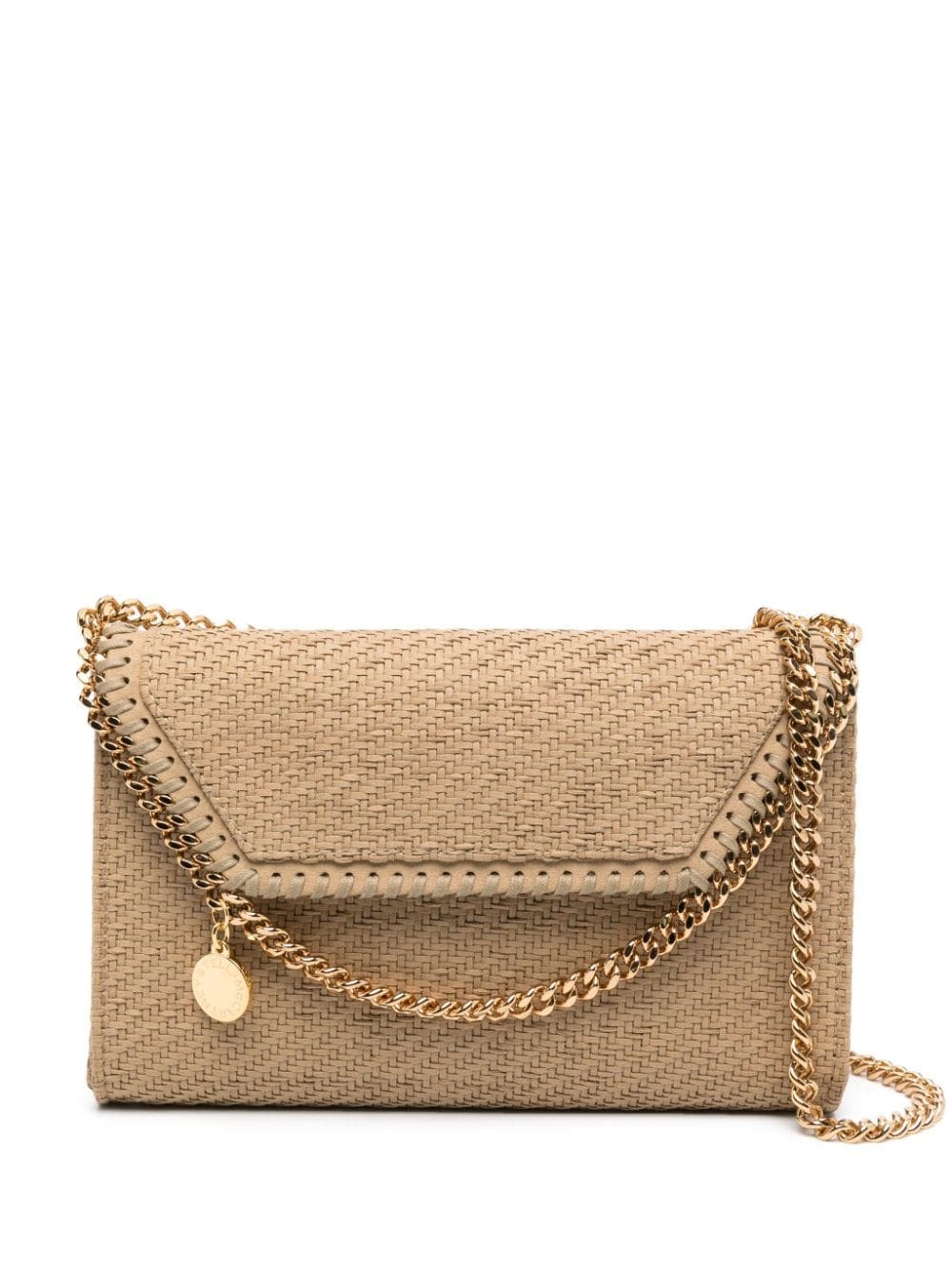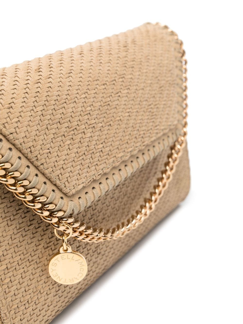Stella McCartney's Falabella bags run the gamut of silhouettes and constructions, but all share the same diamond-cut chains and whipstitched trims. This beige crossbody is woven from strips of faux suede to an envelope silhouette with a gold-tone logo charm at the top handle.