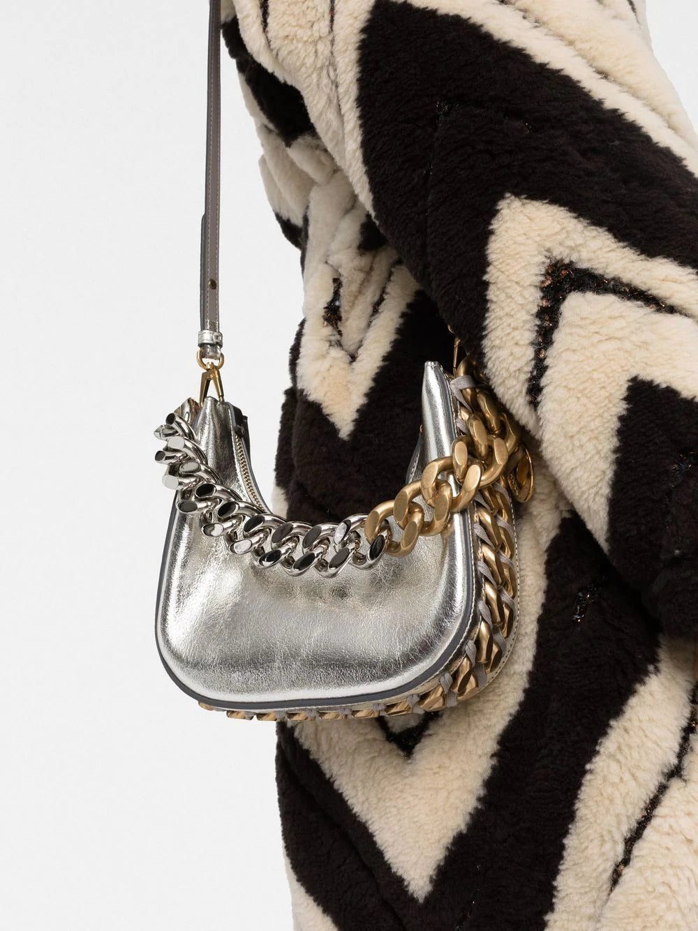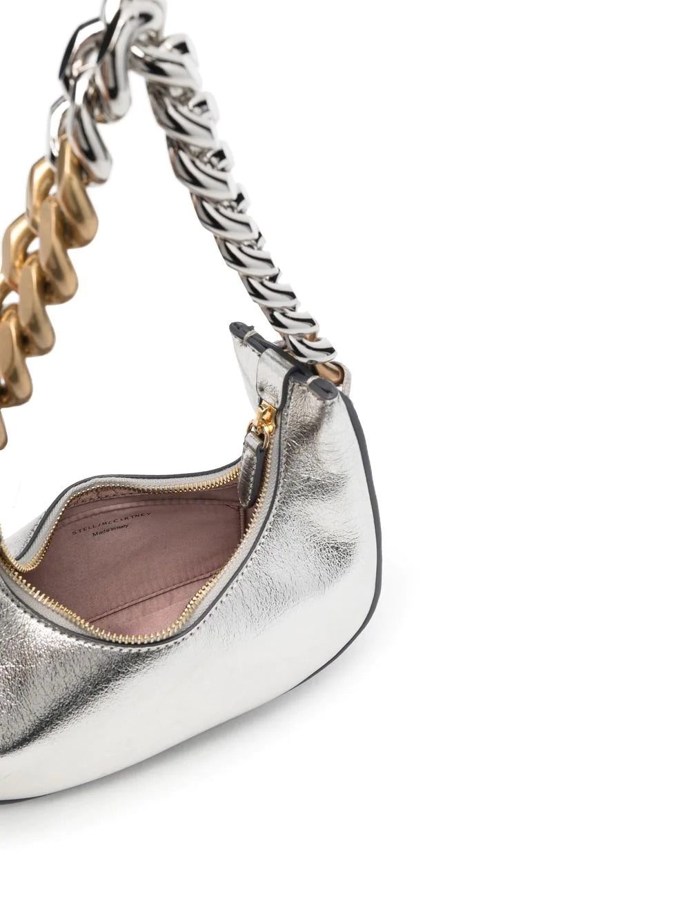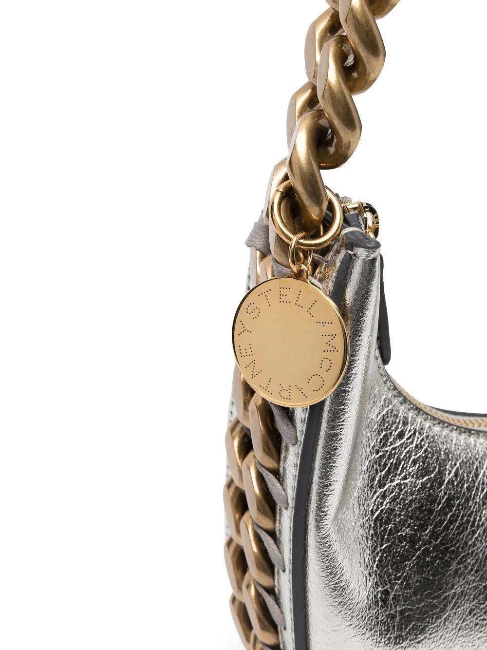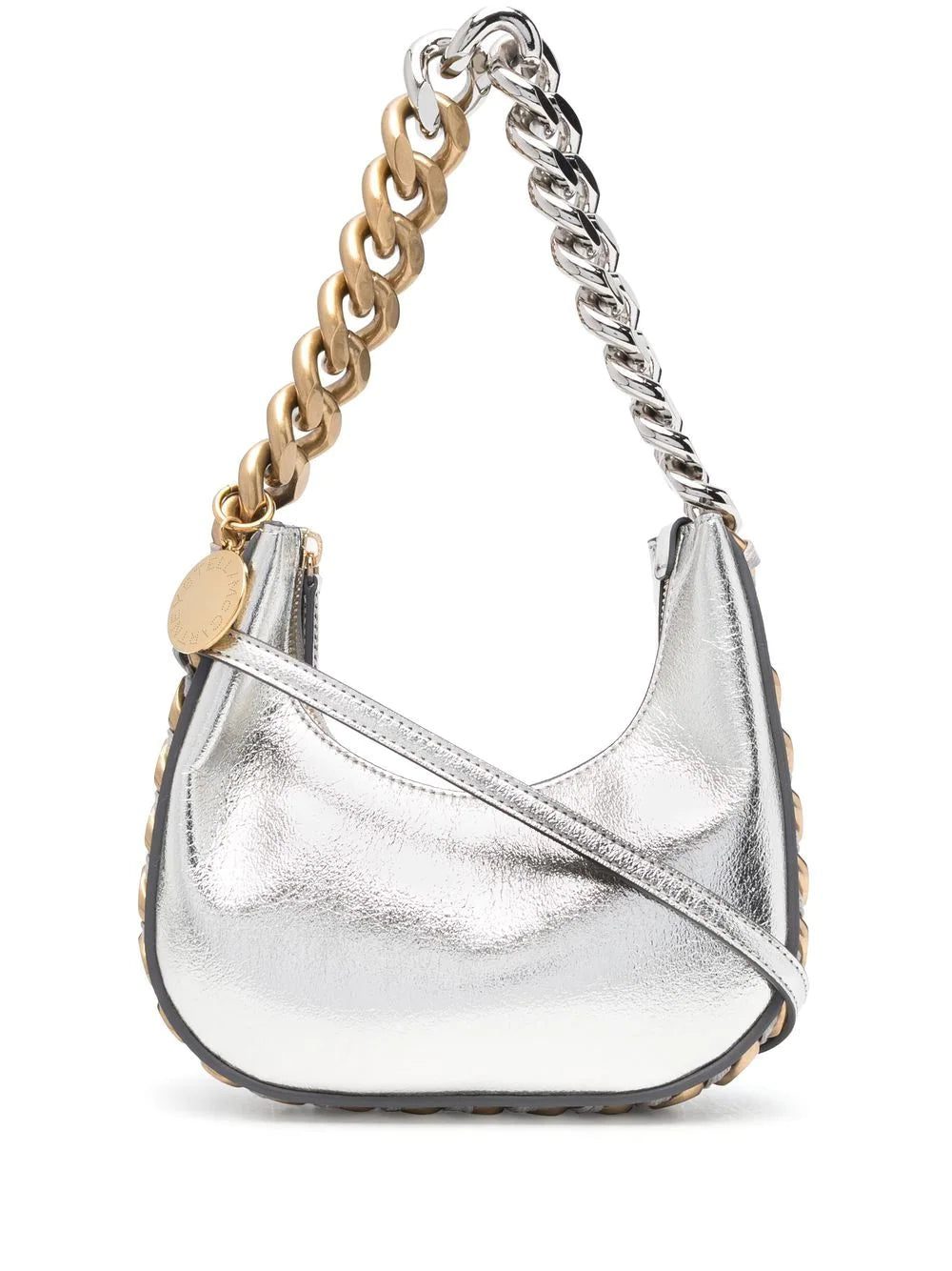 Stella McCartney updates its signature diamond-cut chain detailing each season, refreshing the classic trim for new silhouettes. Crafted from the brand's faux leather in a metallic finish, this mini Frayme zipped shoulder bag is embellished with the chunky gold and silver-tone chain, interwoven with the trademark whipstitch detailing.
