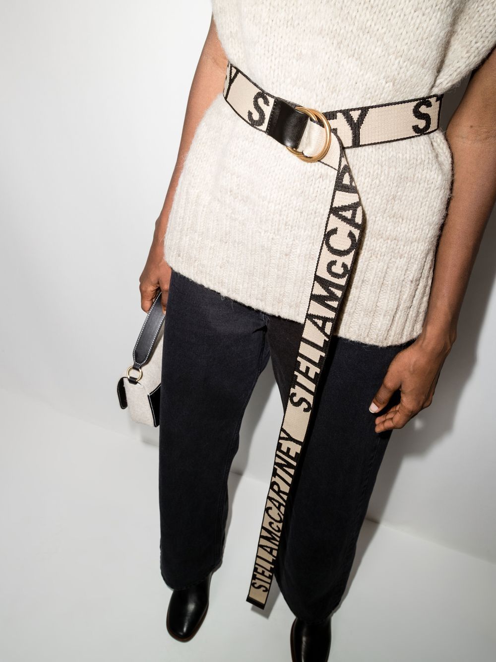 Stella McCartney combines its eco-conscious ethos with its signature branding, creating this logo-jacquard belt. The accessory is made from recycled polyester and is designed in ecru and black hues.