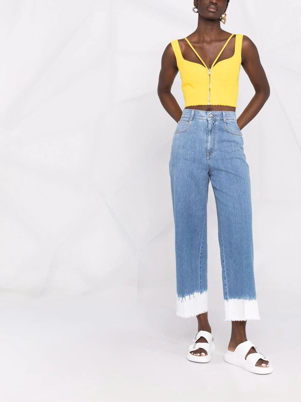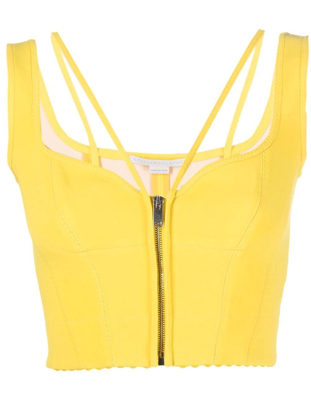 Stella McCartney's Spring 2022 collection signals a return to (night)life, created for women 'living in the moment and conscious of tomorrow'. Blending the nostalgic with the futuristic, this scuba zip corset top in mimosa-yellow is designed with spaghetti strap detailing and a delicately scalloped hem.