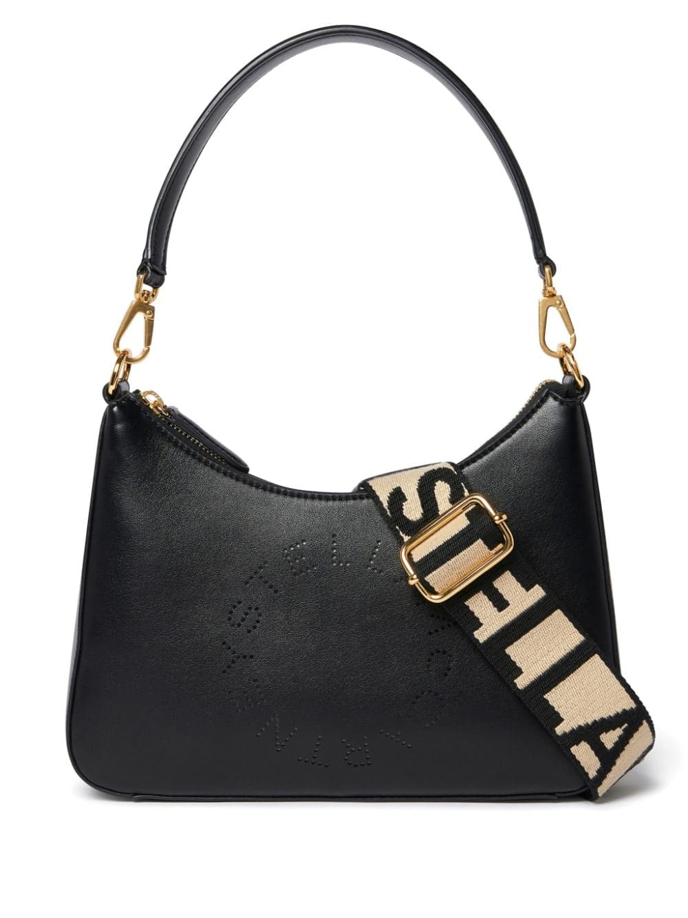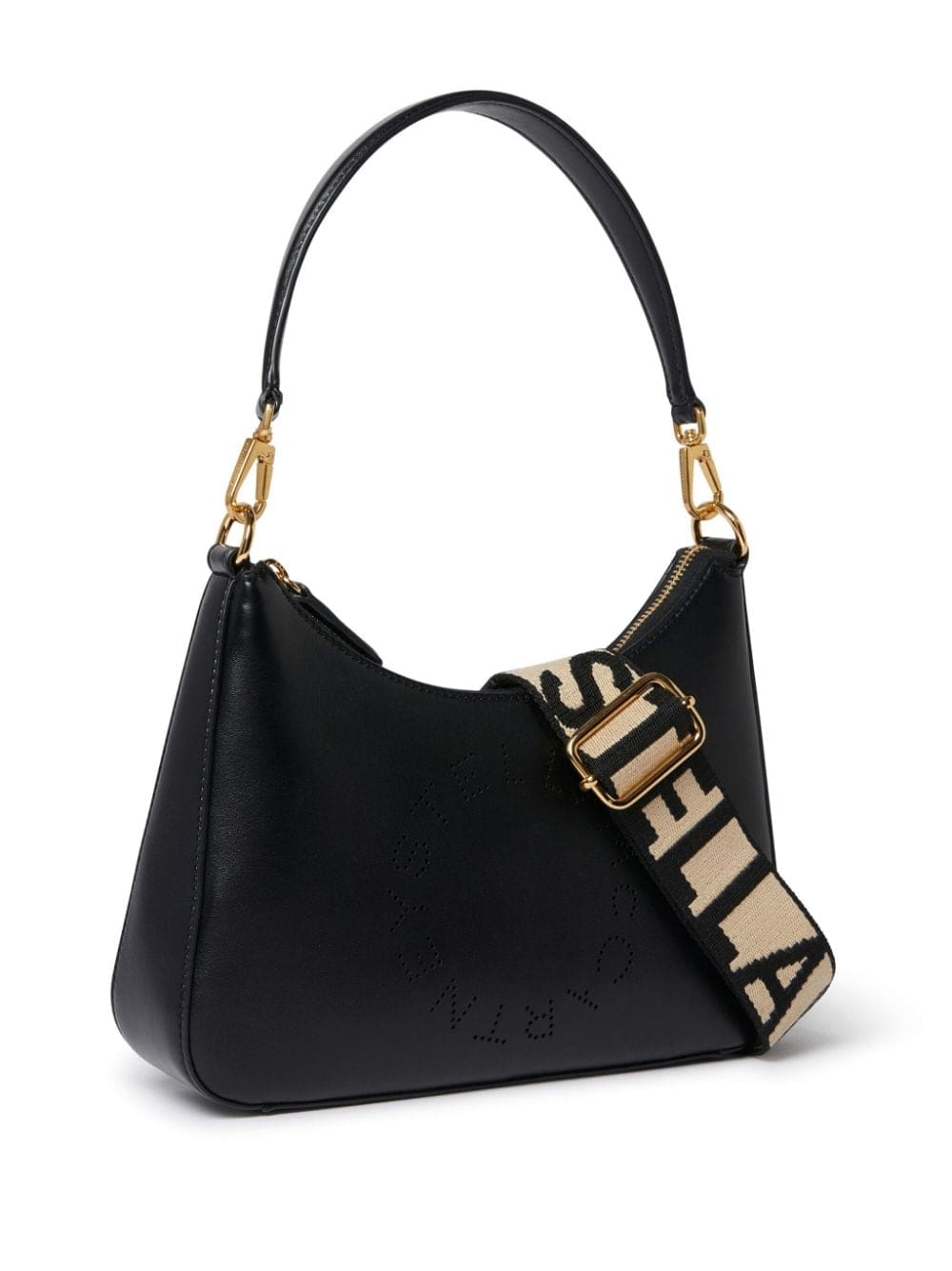 Stella McCartney's SS24 accessory lineup builds on 'iconic styles in new nature-positive material innovations', evidenced by this Logo shoulder bag. Crafted from smooth Alter Mat faux leather, this iteration boasts a curved silhouette with a detachable top handle and an additional logo-jacquard canvas strap made from recycled polyester. Its front is adorned with the iconic perforated logo detailing it is named after, adding the final touch.