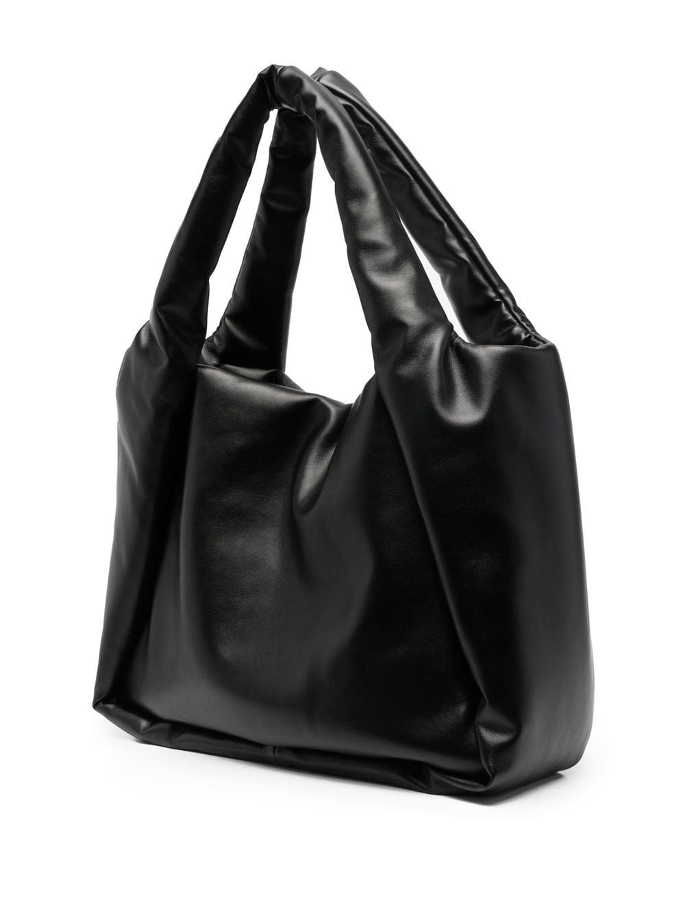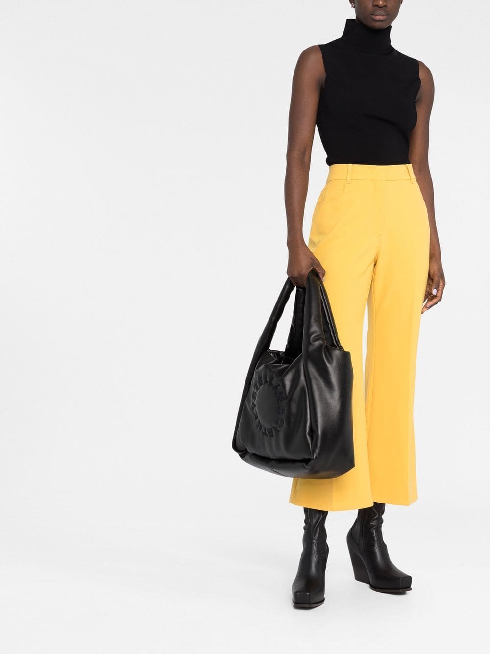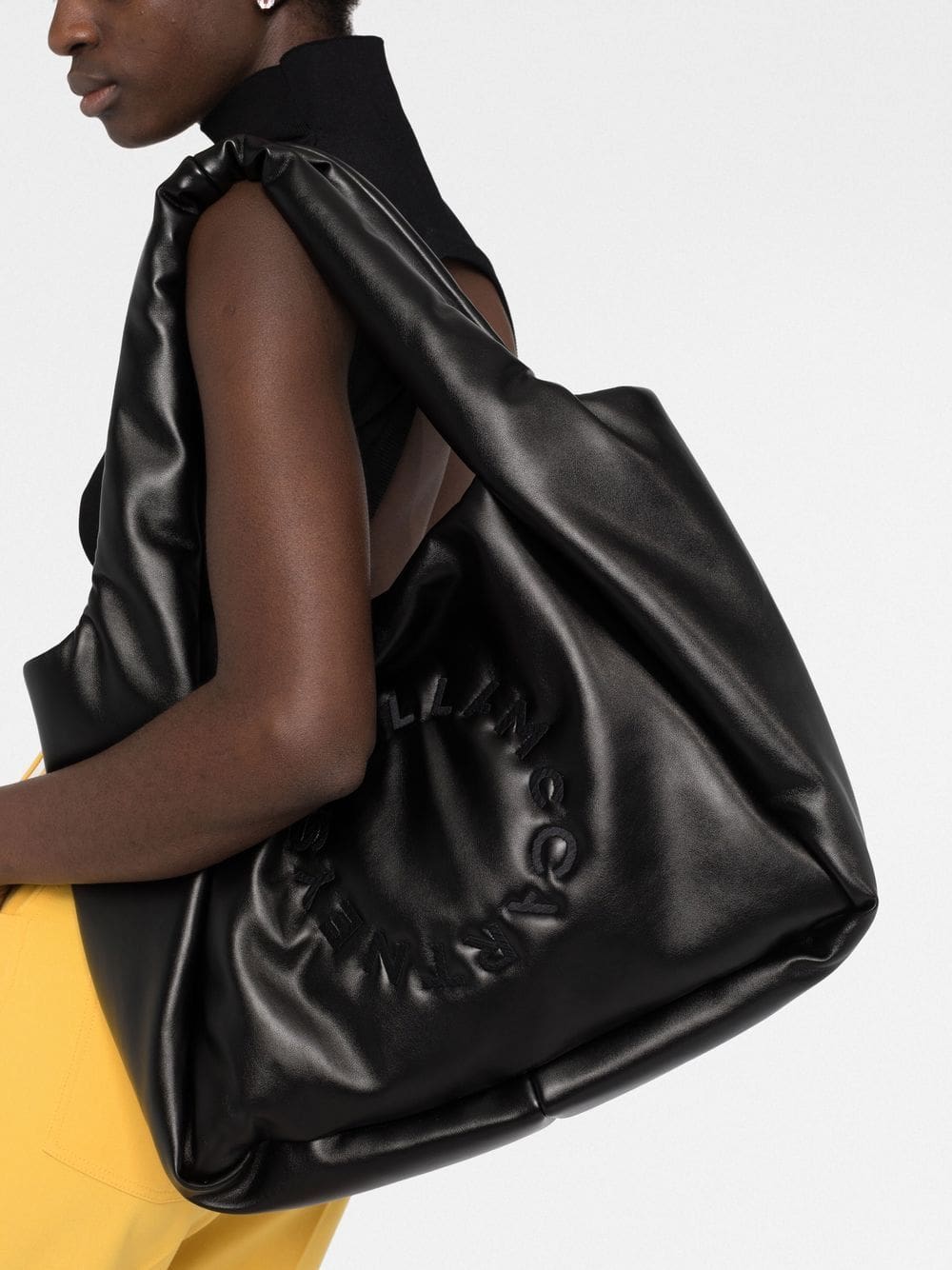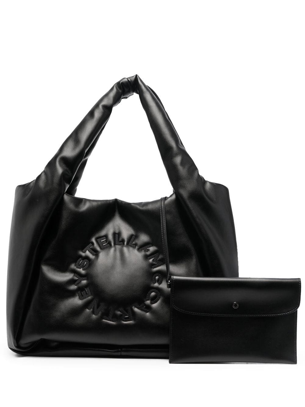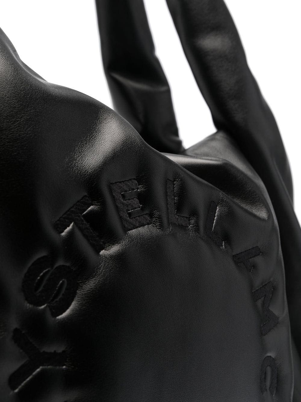 Stella McCartney presents a padded iteration of the signature Stella Logo tote for SS23. Crafted from faux leather, it’s subtly elevated with an embroidered circular emblem at the front.