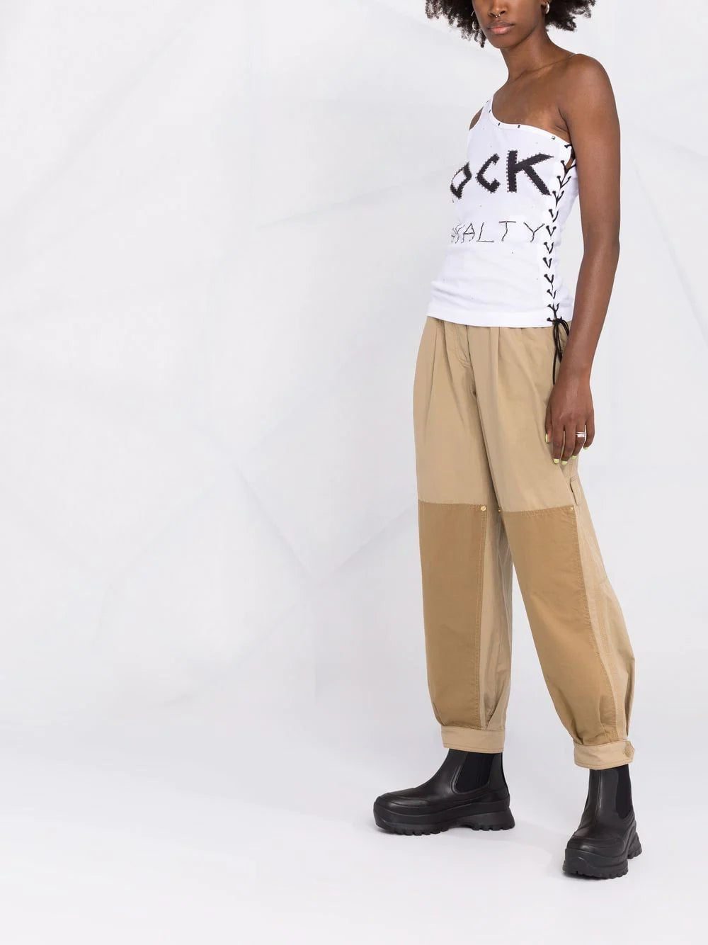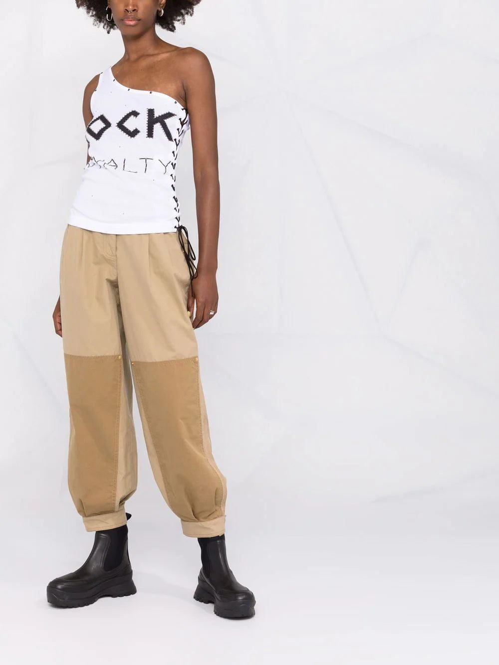 Stella McCartney takes on a rock and roll aesthetic this SS22. Finished with studs and side lace-up detailing, this one-shoulder vest top evokes a defiant attitude.