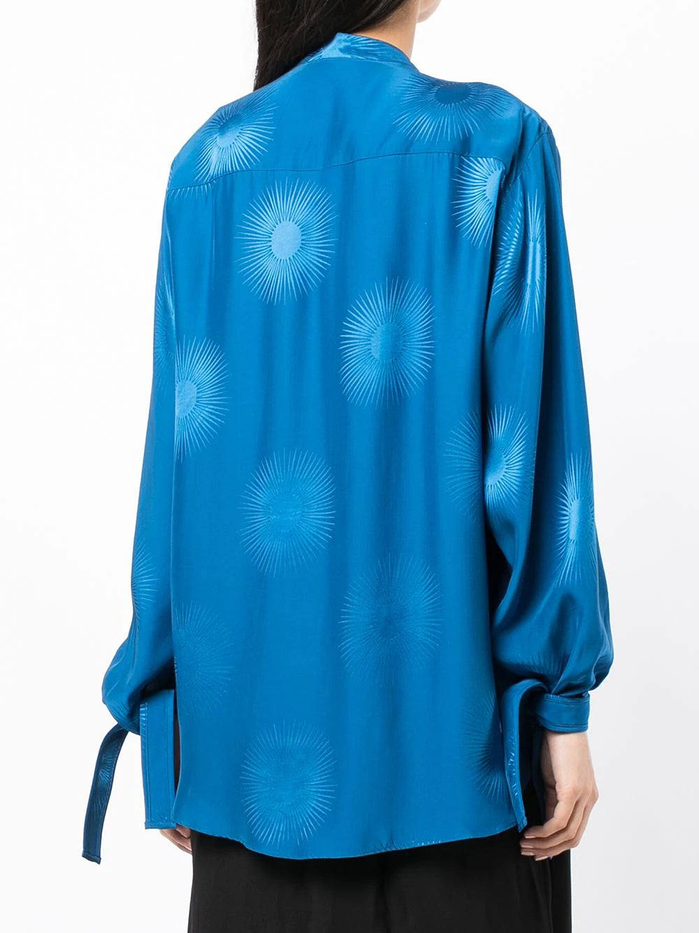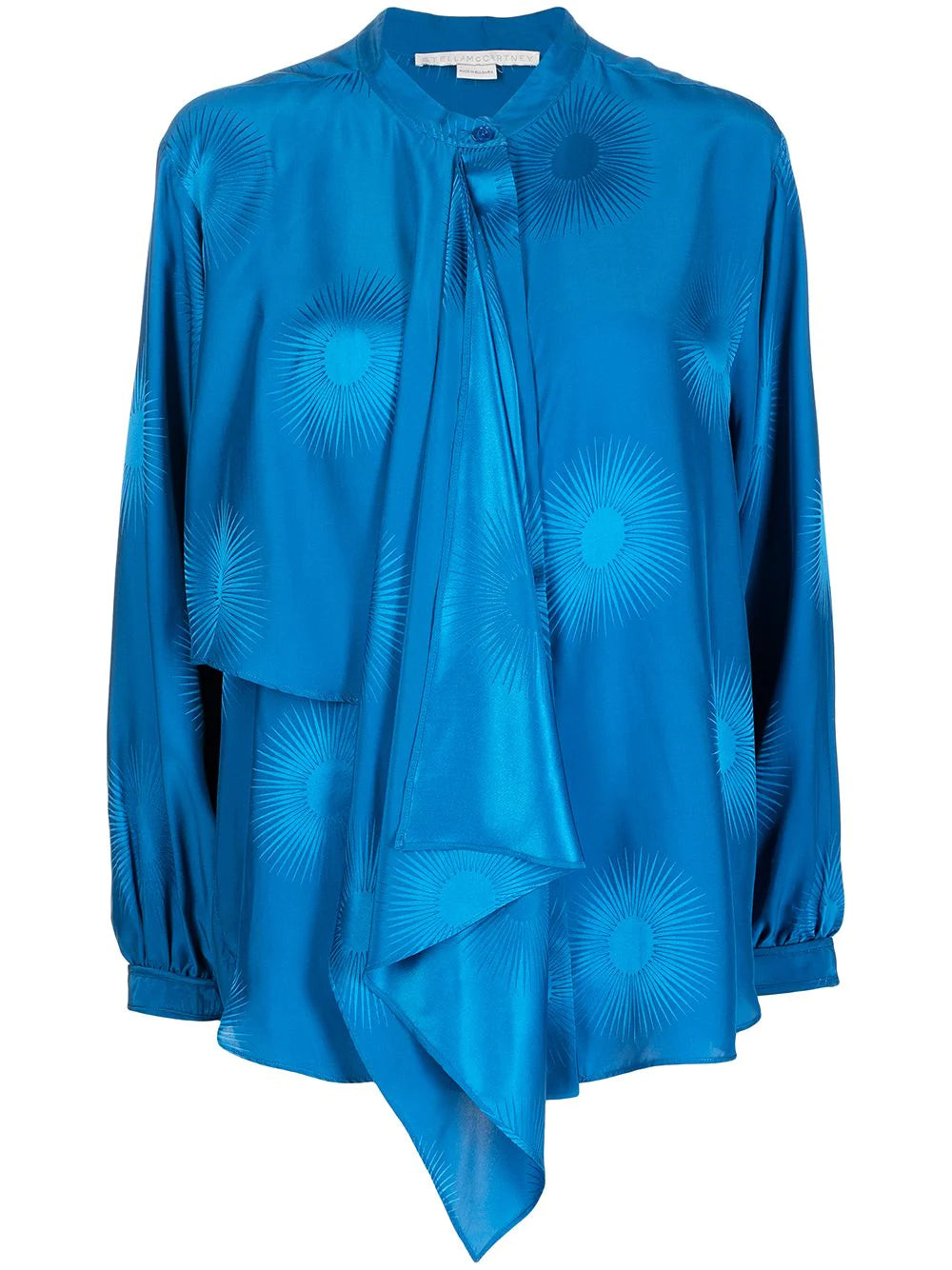 Sailor blue silk blend sunburst-jacquard scarf-detail blouse from STELLA MCCARTNEY featuring patterned jacquard, scarf detailing, balloon sleeves, tied cuffs and concealed front button fastening. POSITIVELY CONSCIOUS: We've partnered with Good On You — an ethical agency that rates how sustainably brands perform across various people, planet and animal welfare criteria. This product comes from a Conscious brand that performs well in relation to their impact on animals..