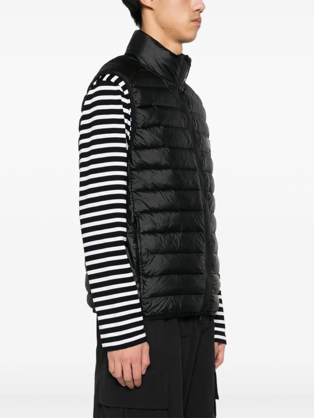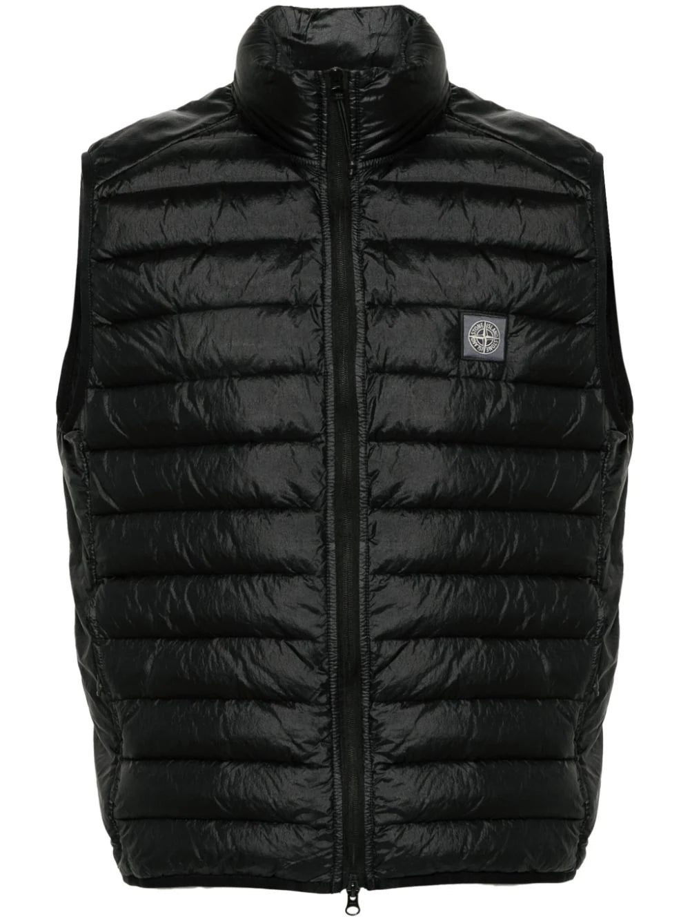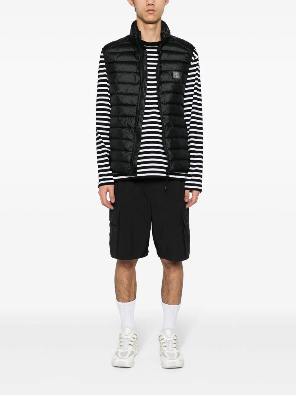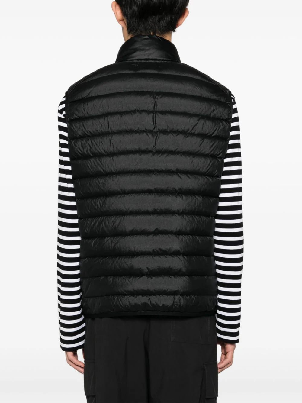 In line with the brand's penchant for technical, protective outerwear, this black Stone Island gilet is injected with a down-feather filling and quilted to lend evenly distributed insulation. It boasts a high-neck silhouette with a front two-way zip fastening and side pockets, as a Compass appliqué at the chest adds the final touch.