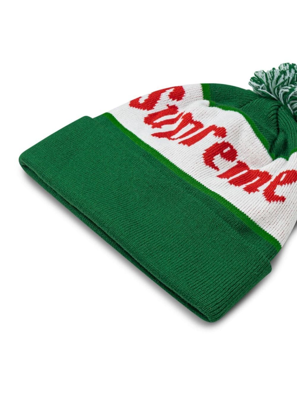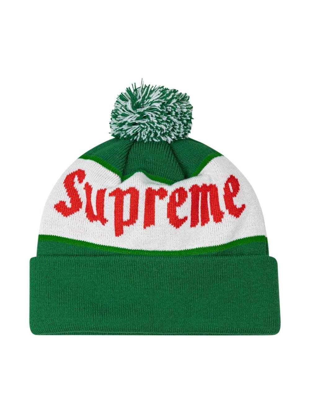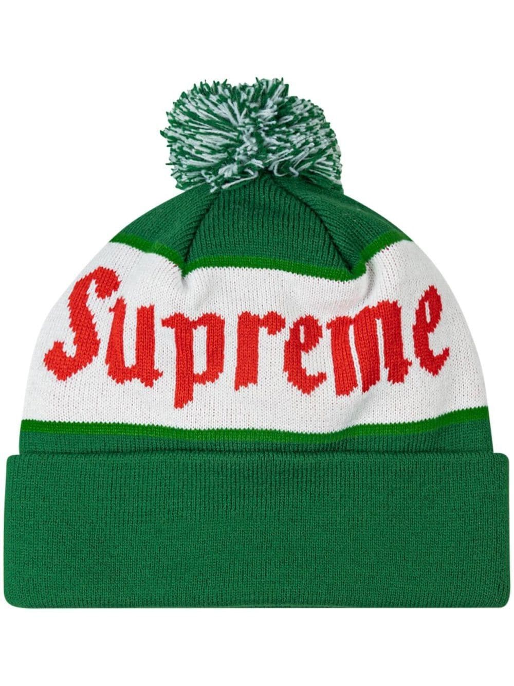Supreme's Alpine beanie is defined by its vibrant colours and pompom detail at the top. The accessory features a knitted construction - in white and green hues - and is enhanced by a contrasting intarsia-knit logo.