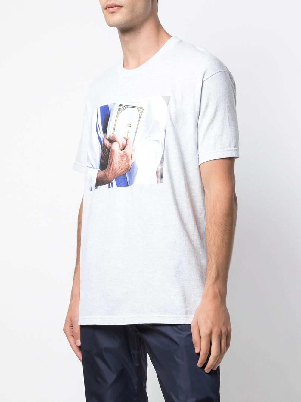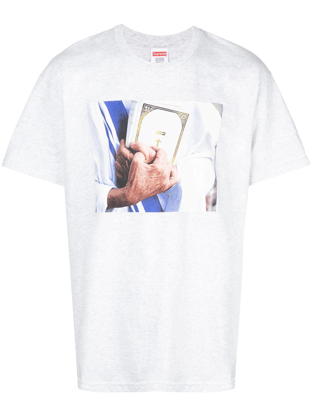 The Supreme Bible Tee is an ash grey short sleeve shirt that uses powerful imagery to tell its story. Released exclusively for the “World Famous” streetwear brand’s Fall/Winter 2019 season, the Bible Tee features a graphic of an elderly priest holding a Supreme-branded bible close to his chest. A gold foil cross can be seen beneath the Supreme branding on top of the bible with the words “Holy Bible” appearing in gold foil on the spine.
