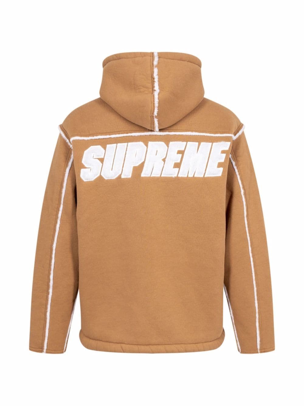 Supreme is known for using branding details across each collection of streetwear staples. Staying true to the New York-based label's know-how, this beige hooded jacket is made of faux-shearling and highlighted by a logo appliqué on the back.