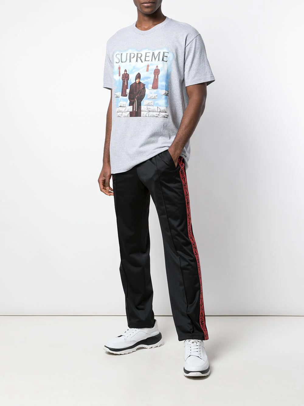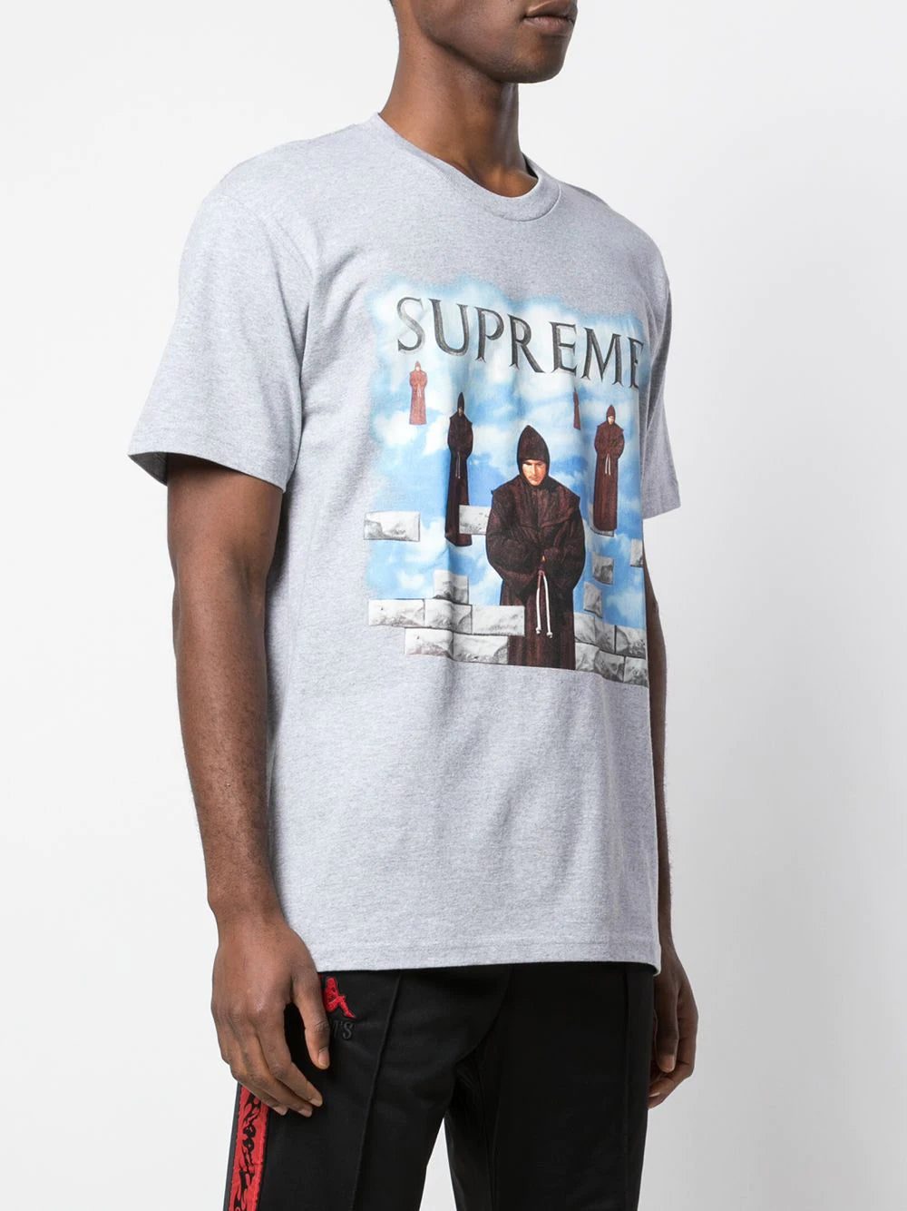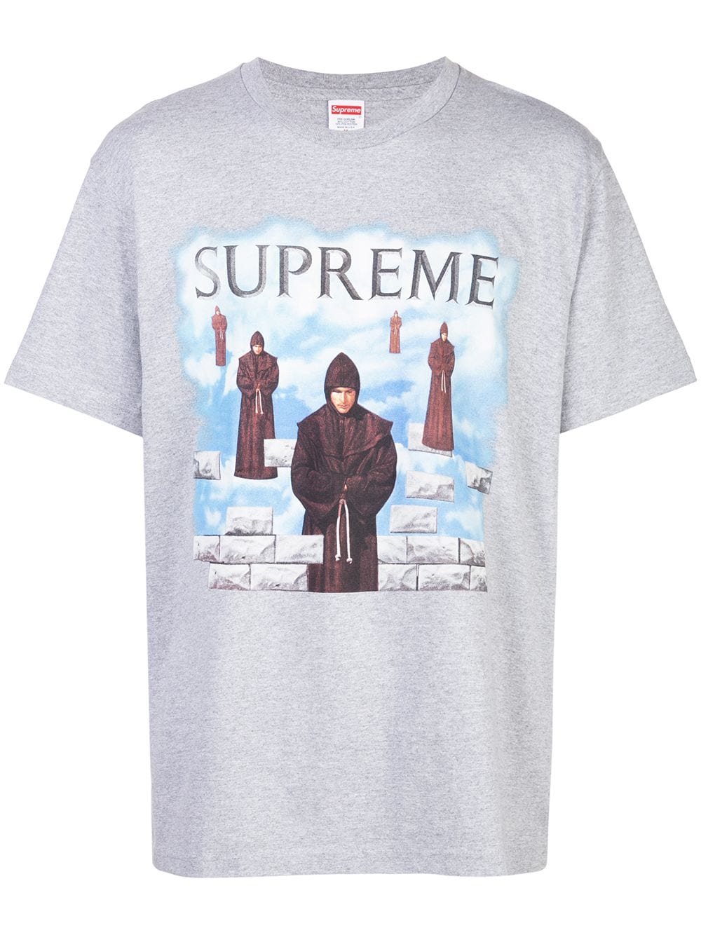 The Supreme Levitation Tee is a heather grey short sleeve graphic T-shirt from Supreme's Fall/Winter 2019 season that was inspired by an album cover for "Chants," which was written by the Benedictine Monks of Santo Domingo de Silos. One of the more obscure references of the season, the front of the tee features several floating monks against a white cloud backdrop. Rounding out the design are mismatched grey bricks that appear on the bottom of the graphic and grey Supreme branding on the top portion of the tee.