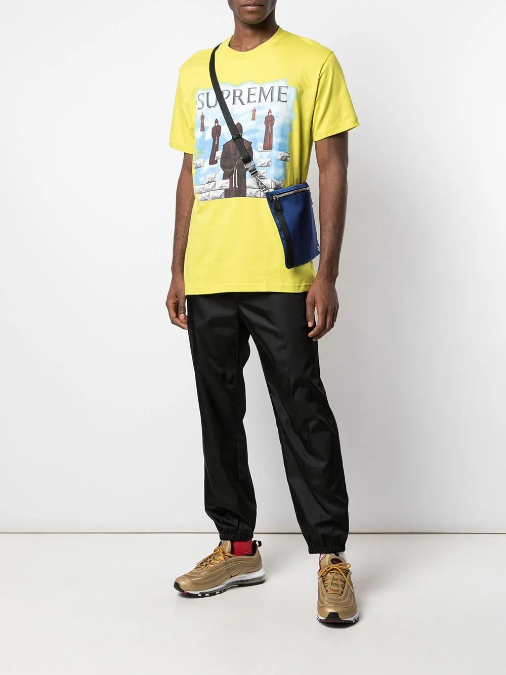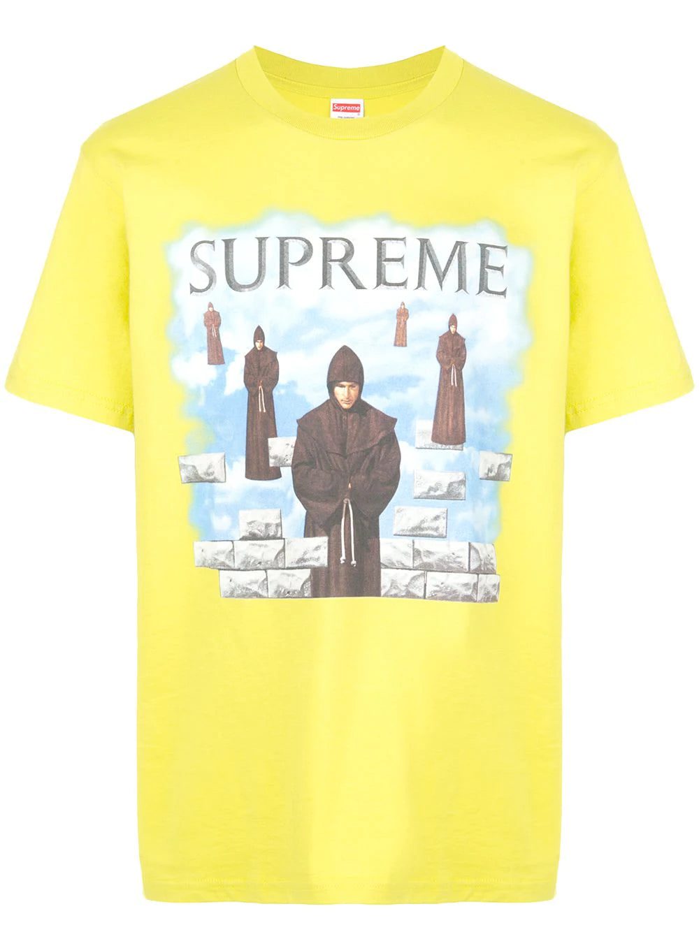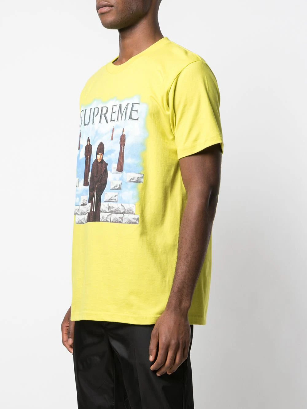 The Supreme Levitation Tee is a colorful short sleeve graphic T-shirt that fits right in with the string of recent releases from the iconic streetwear brand. Using a lime green-like Sulfur color and 100% cotton construction, the Levitation tee features reimagined cover artwork from the “Chants” album written by Benedictine Monks of Santo Domingo de Silos. Several floating monks appear against a cloud backdrop with cement bricks sitting on the lower portion of the graphic. The Supreme Levitation Tee in Sulfur was released during the brand's Fall/Winter 2019 season.