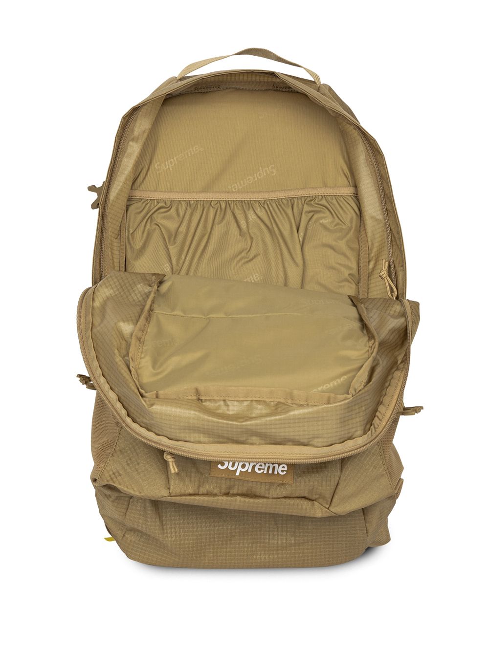 A February SS21 release, the Supreme logo-print backpack is presented here in a beige colourway. The brand's commitment to quality is shown in the craftsmanship of this piece.