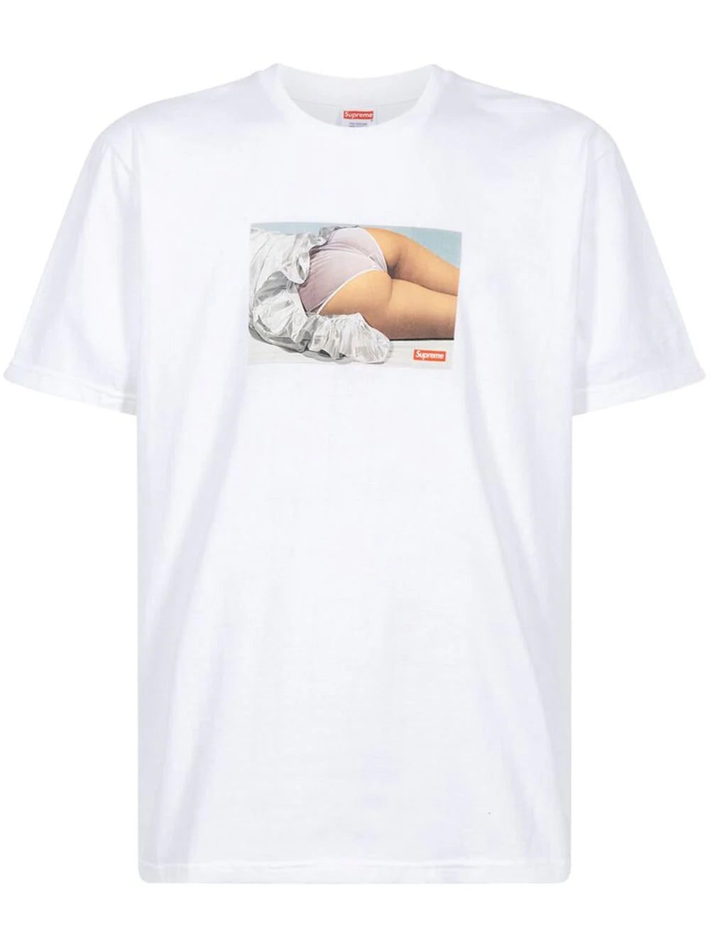 The Supreme Maude T-shirt, in white, is one of several colourways of the short-sleeve T-shirt from the 'world famous' streetwear brand’s AW22 collection. This model is crafted from cotton and features the brand’s signature boundary-pushing graphics on the chest. A small red Supreme box logo appears inside the image.