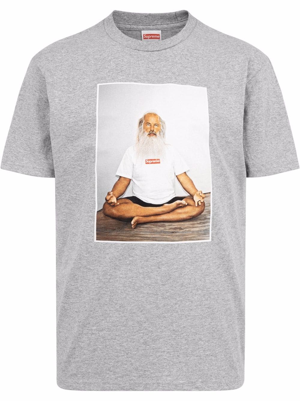 The Supreme Rick Rubin T-shirt is a short-sleeve piece from the brand’s AW21 collection. It features a portrait-style graphic of the legendary record producer Rick Rubin - known for working on classic albums with the likes of the Beastie Boys, Jay-Z, Slayer, and others. Here, an image of him in a meditative pose while wearing Supreme’s iconic box logo tee appears front and centre on the chest.
