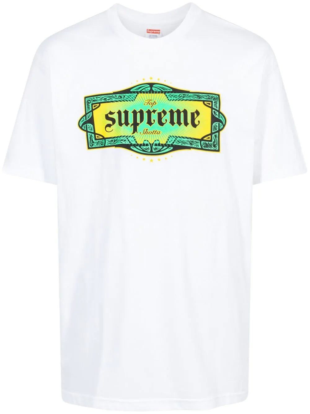 The Supreme Top Shotta Tee “White” is an all-cotton short-sleeve T-shirt from the AW22 collection with a casual Jamaican vibe. This model was released in multiple colours, as is customary for the brand’s T-shirt collections, and is highlighted with a yellow and green 'Top Shotta' graphic on the chest. The phrase is taken from Jamaican street culture, a movement Supreme has honoured countless times in the past.