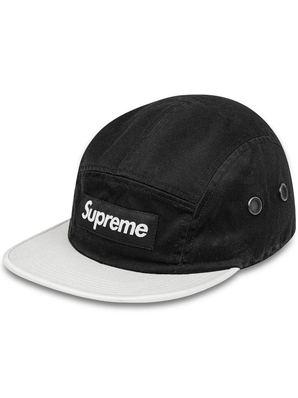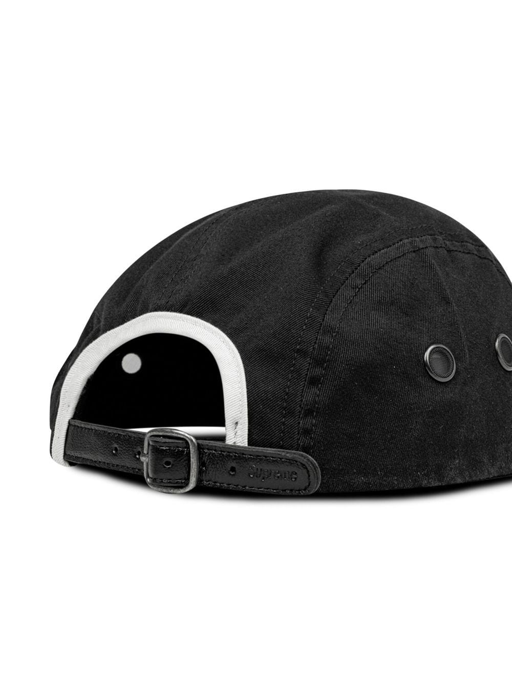 Supreme's classic camp cap is back. Here, the accessory is presented in a full black hue, enhanced by a white curved peak and a signature box logo on the front.
