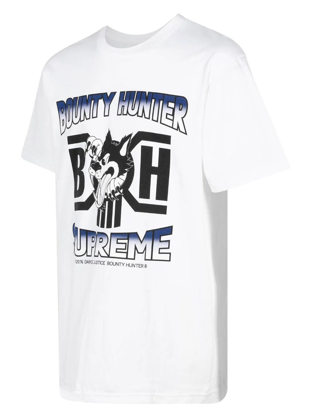 Supreme has teamed up with Japanese brand, Bounty Hunter, on a new collection for SS24. Blending the Tokyo-based brand punk ethos with Supreme's relaxed style, this cotton T-shirt features a white design enhanced by an oversized logo at the front in the middle of a 'fearless' wolf.