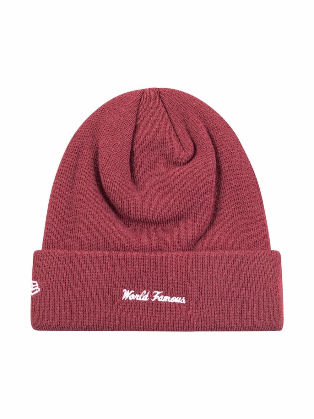 The Supreme x New Era beanie is highlighted with a signature box logo on the front while the New Era logo appears on the side and a 'World Famous' motif decorates the rear. Its design features ribbed detailing throughout and comes in an all-red colour for a versatile look.