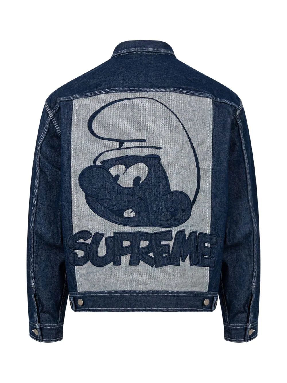 The Supreme x Smurfs denim trucker jacket is an all-cotton piece highlighted with an appliqué logo on the chest and an appliqué graphic on the back. This model features a straight cut and comes with two flap chest pockets and two side inset pockets.