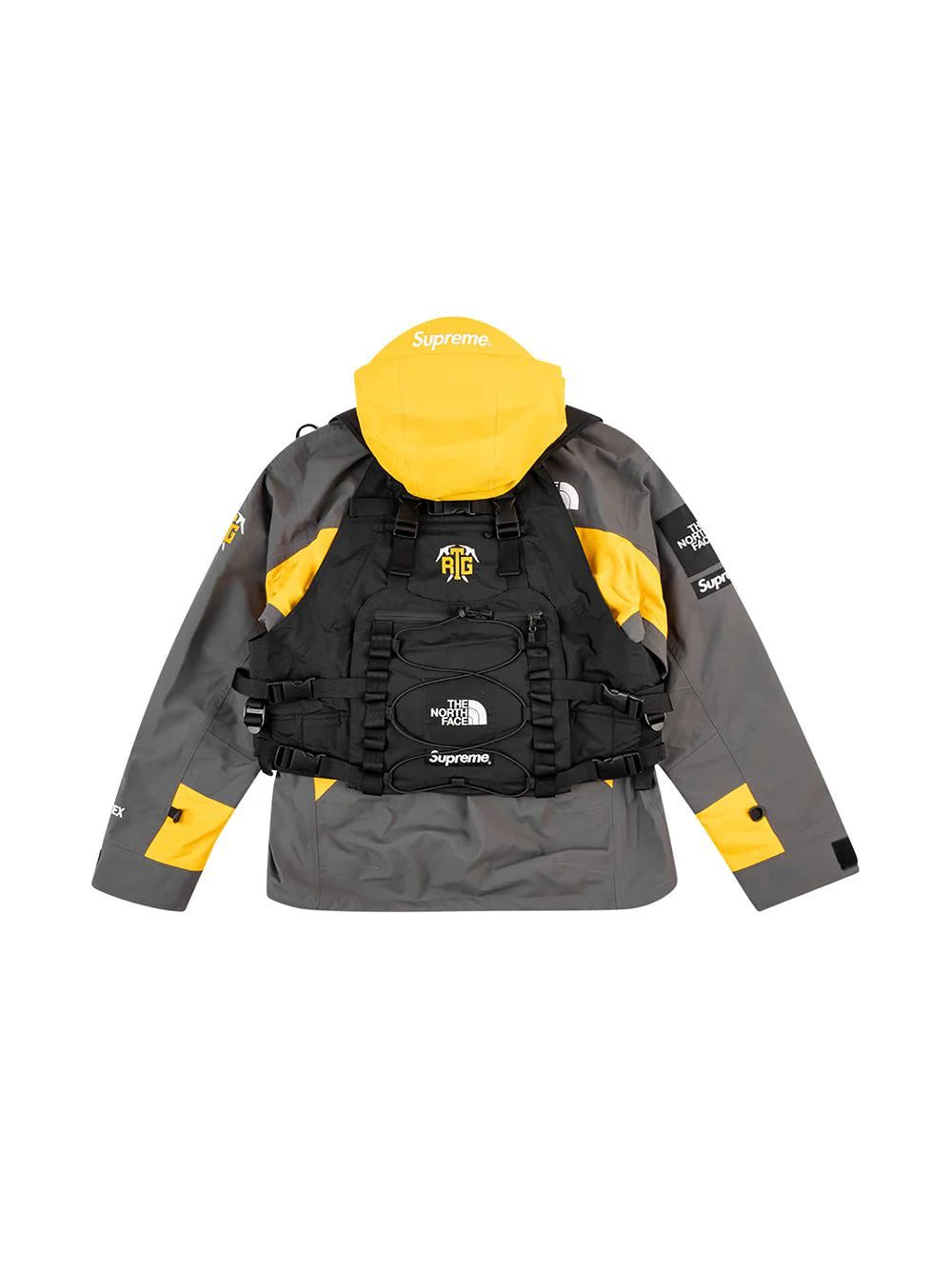 RTG, or Remote Terrain Gear, is a discontinued TNF collection, specifically designed for climbing. And that is shown in the design of this Supreme x The North Face vest-detail jacket. The hood on this piece is designed to fit over a climbing helmet, whilst the vest is removable.
