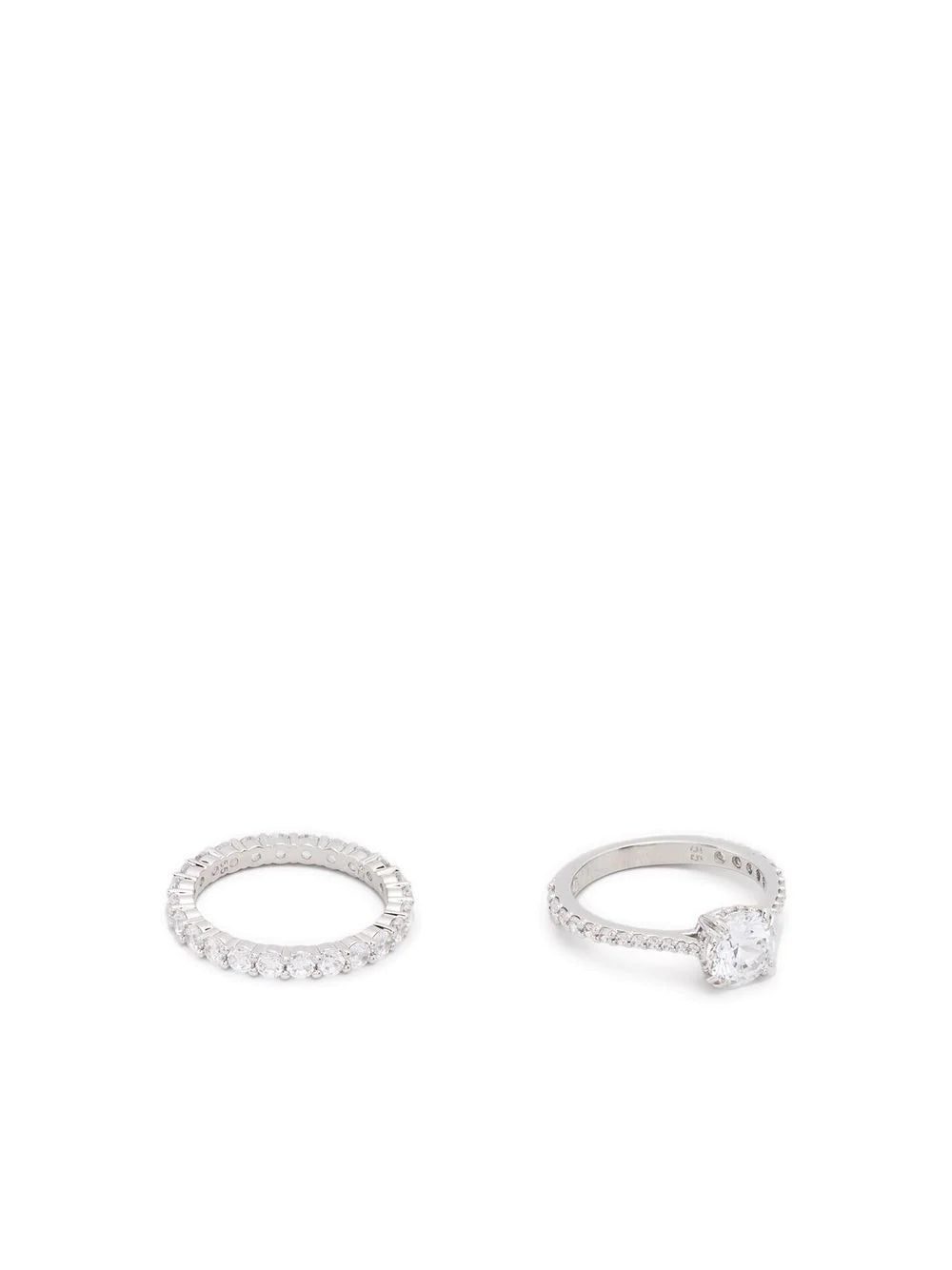 Timeless and versatile, this set of two Swarovski rings features a piece that is embellished with a princess-cut crystal that is flanked by a pavé-set band paired with a band that is encrusted with shimmering stones all around. The rhodium construction lends the accessories a polished finish and longevity.