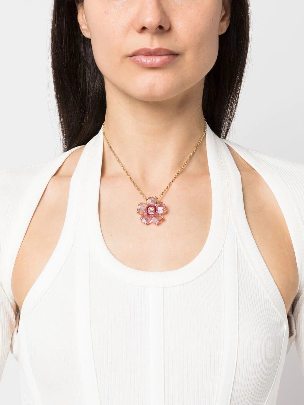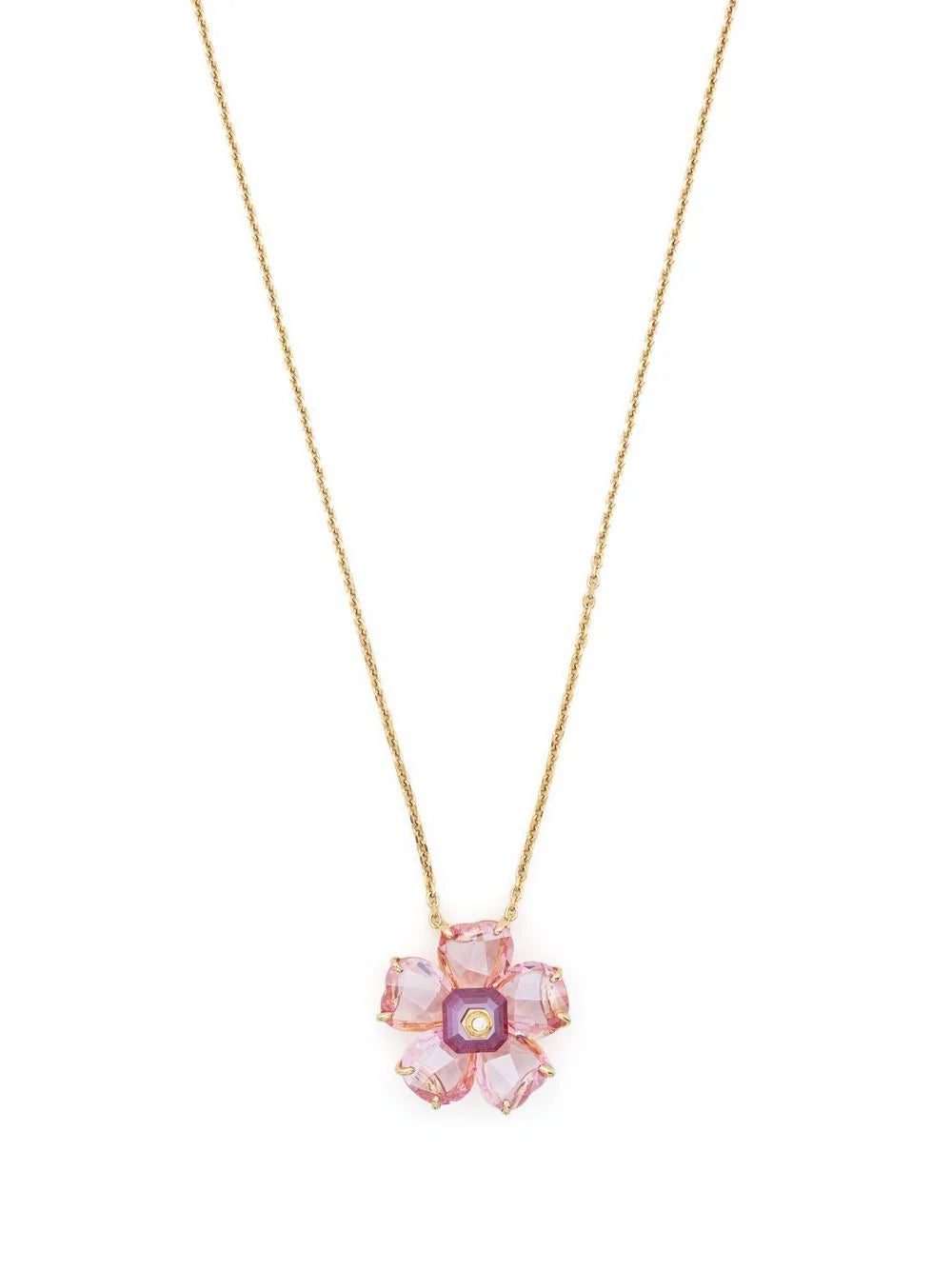glass flower charm necklace from Swarovski featuring pink, gold-tone, glass, brass, flower charm, logo charm, adjustable-length chain and clasp fastening.