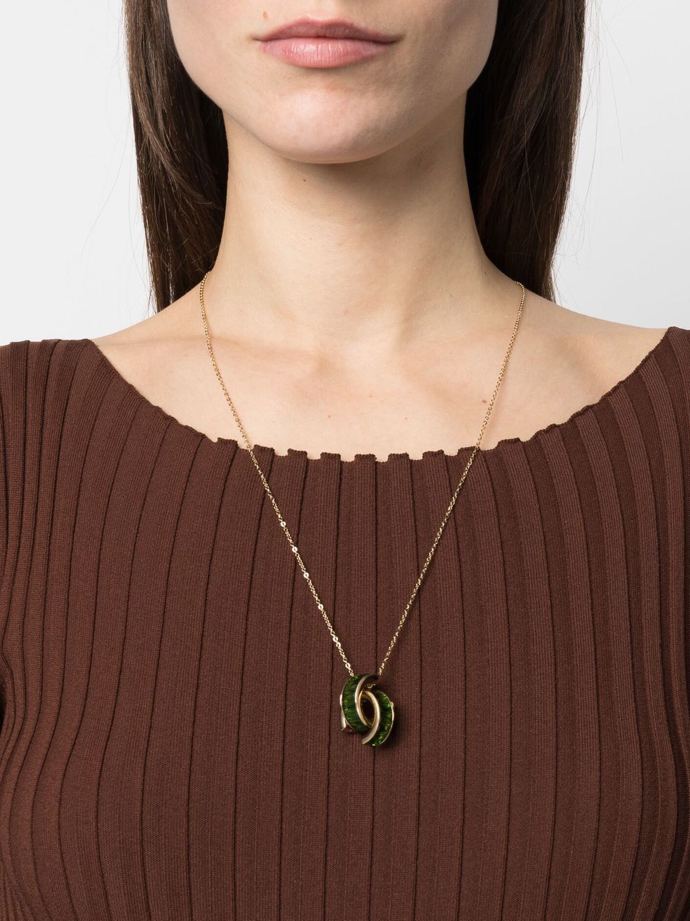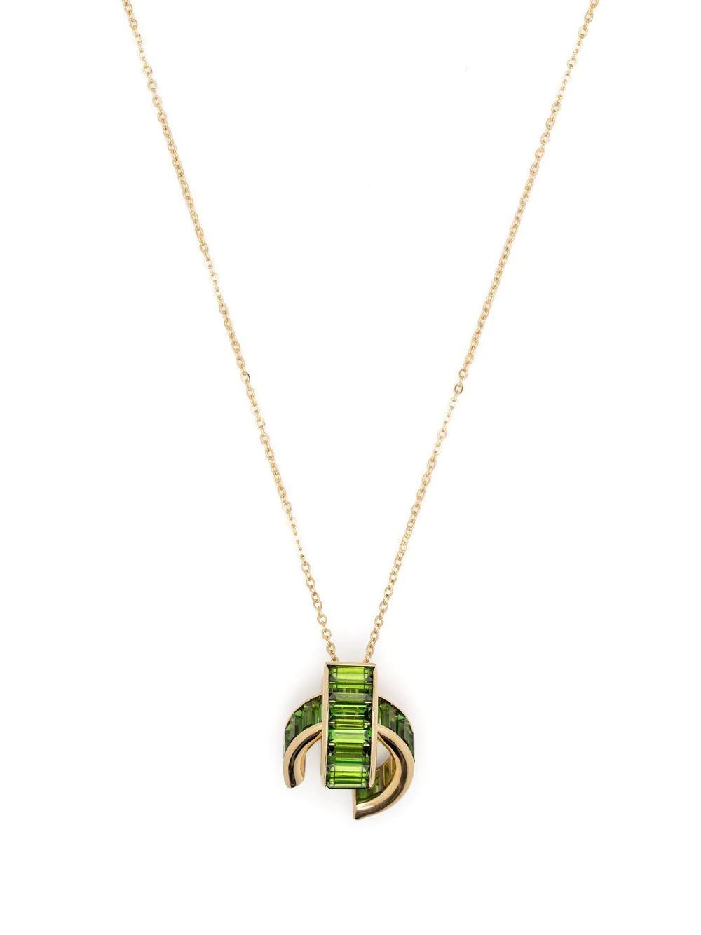 Matrix pendant necklace from Swarovski featuring apple green, gold-tone, plated finish, delicate chain, statement pendant, baguette cut, crystals and sliding knot fastening.