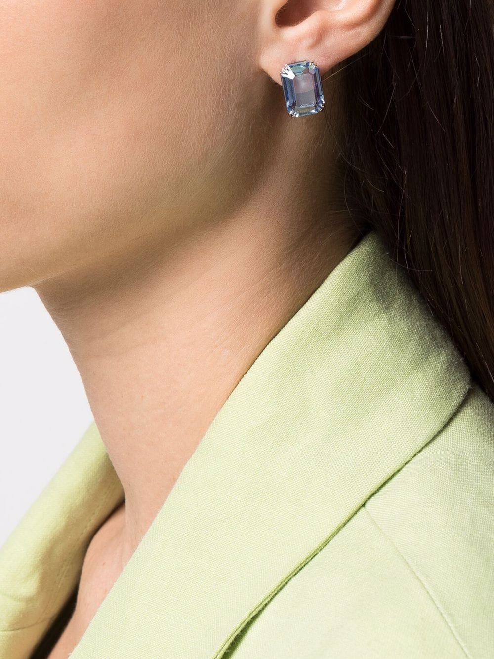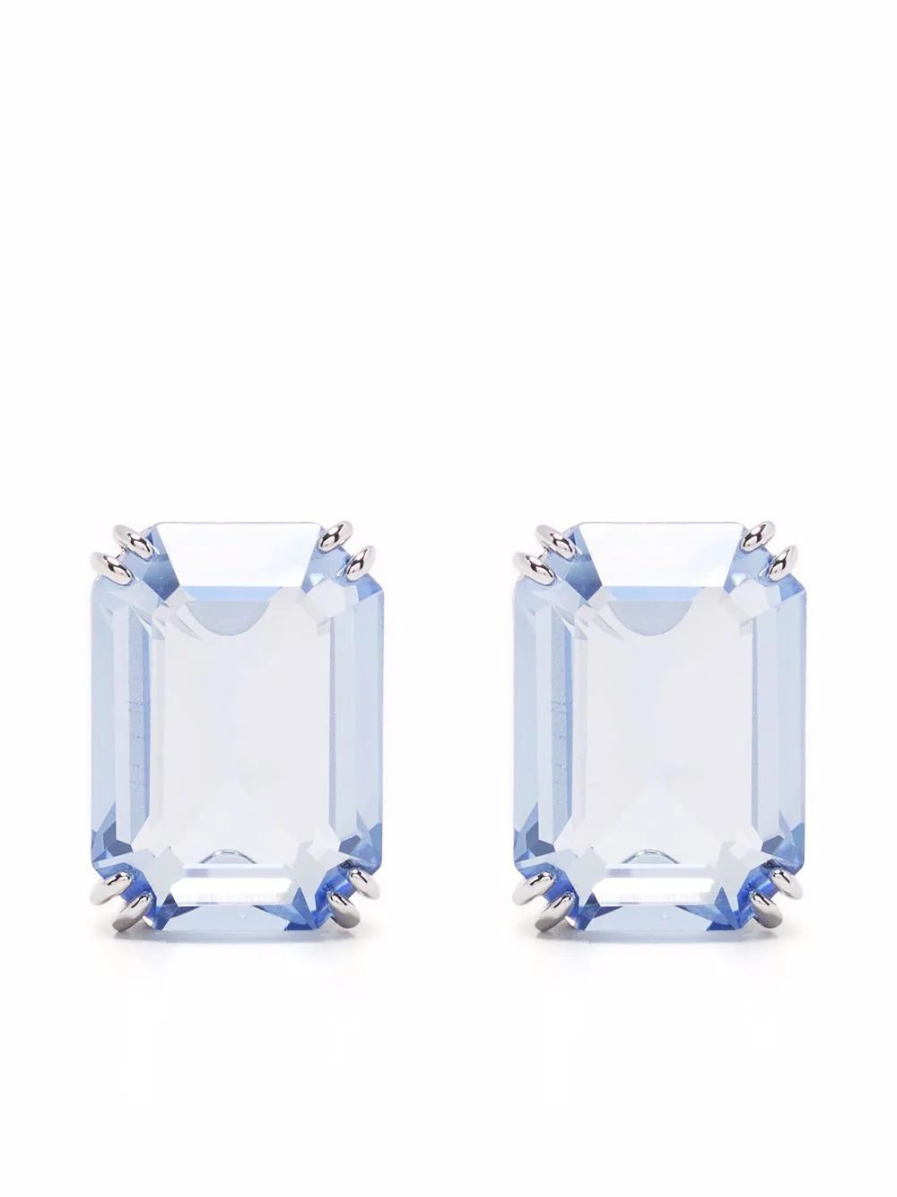 Blue brass/glass Millenia octagon-cut earrings from Swarovski featuring silver-tone hardware, Swarovski crystal embellishment and butterfly fastening. Sold in pairs..