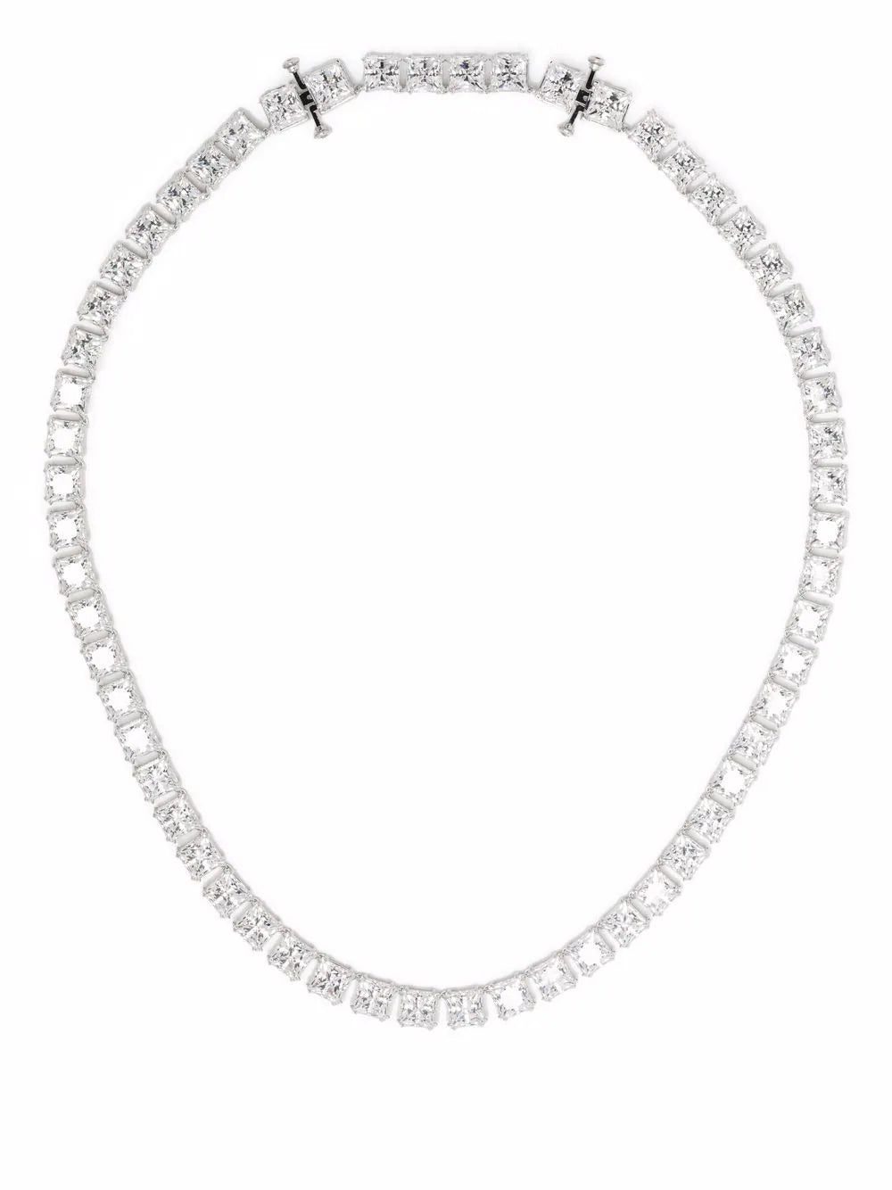 Swarovski's Millenia necklace evokes a timeless elegance that will never go out of style. This rhodium-plated iteration is inlaid with a row of square-cut Swarovski crystals that shimmer from all angles.
