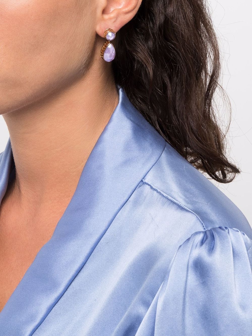 Part of the Orbita family, designed by Creative Director Giovanna Engelbert for Collection I, these asymmetric drop earrings stand out with their mixed crystal cuts in complementary shades of lilac for a colourful finish.