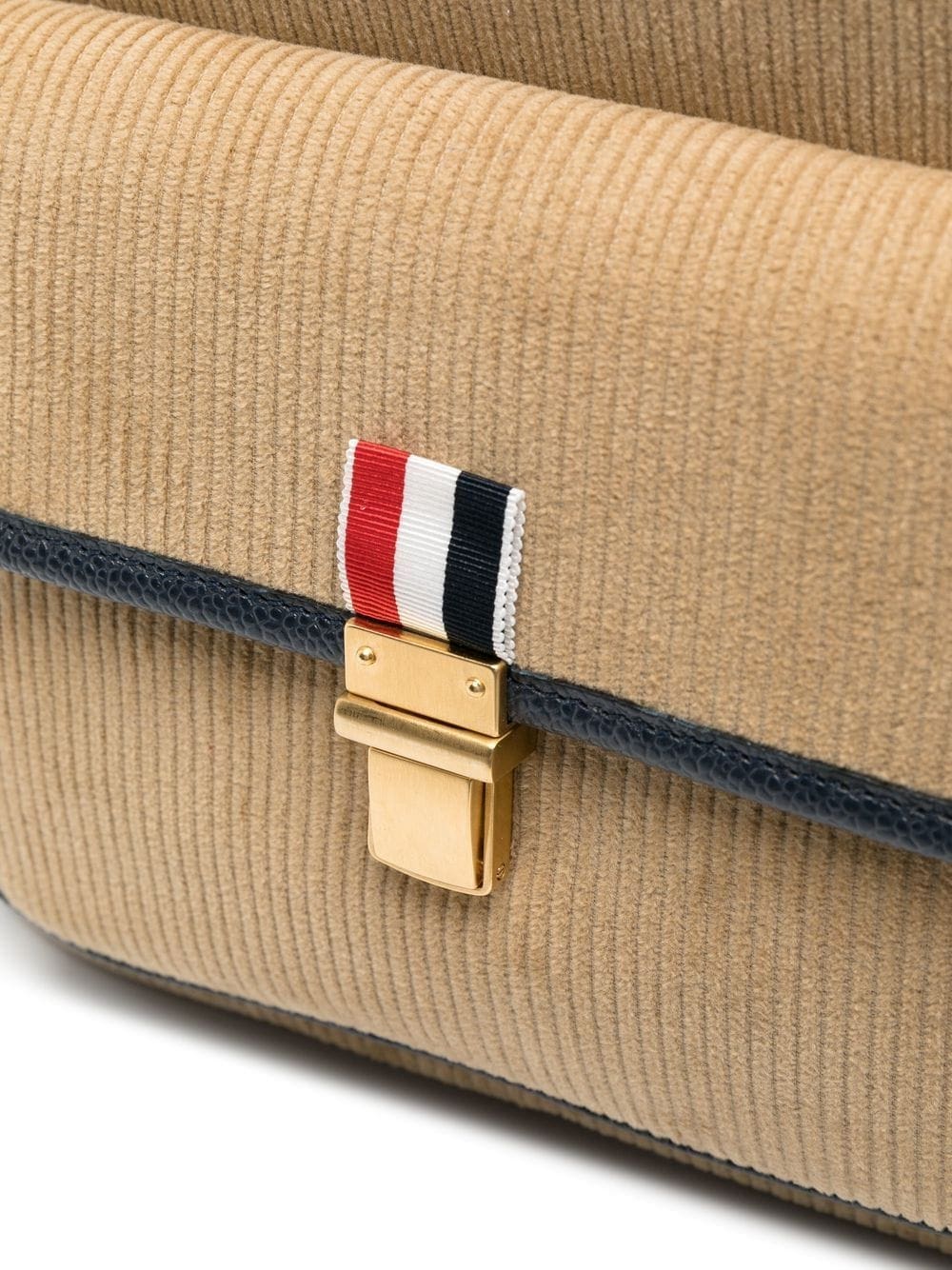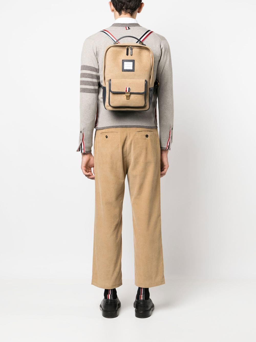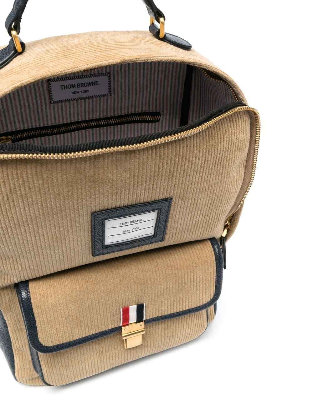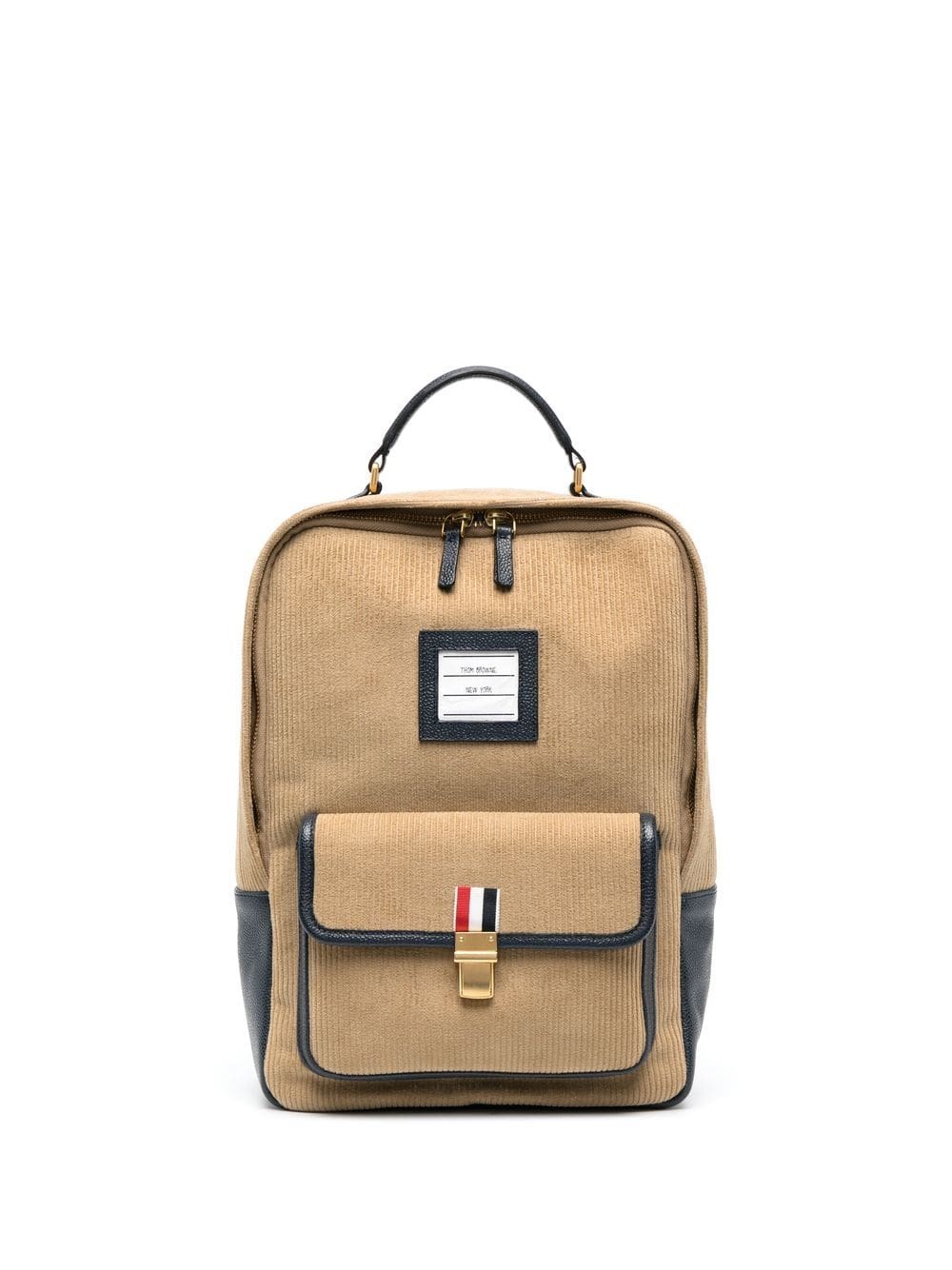 brown/navy blue cotton/calf leather corduroy leather trim logo patch to the front top zip fastening main compartment full lining internal zip-fastening pocket front flap pocket single flat top handle adjustable shoulder straps