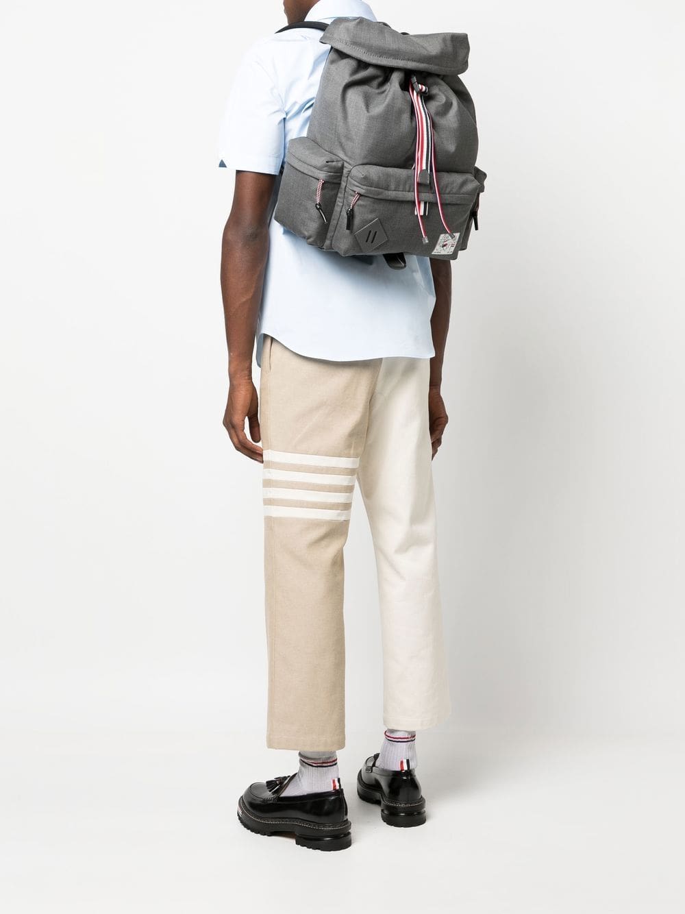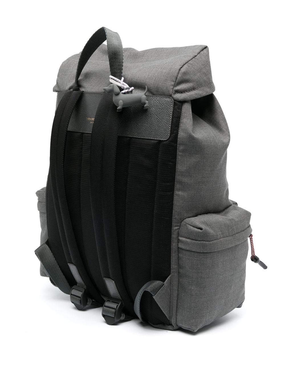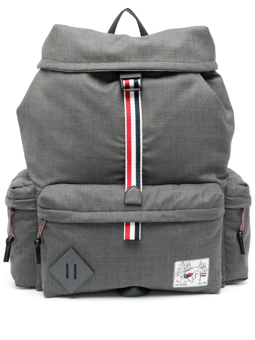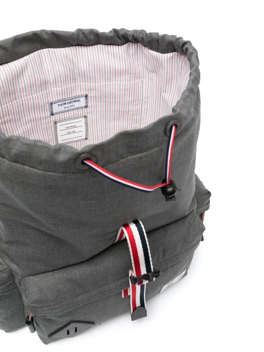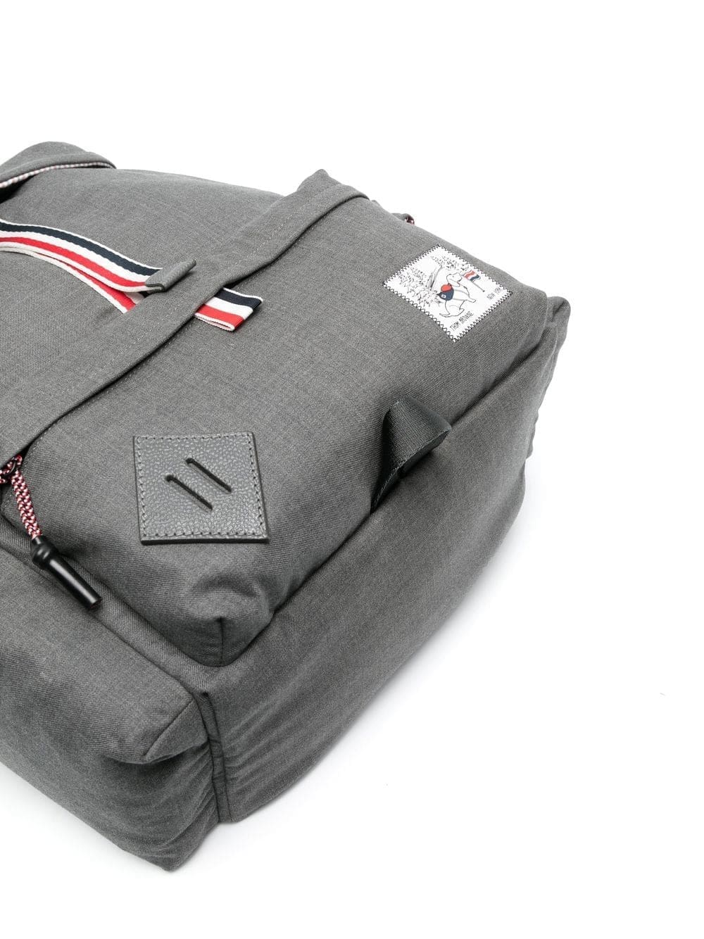 charcoal grey cotton/wool/calf leather stripe trim drawstring fastening front patch pocket logo patch to the front foldover top