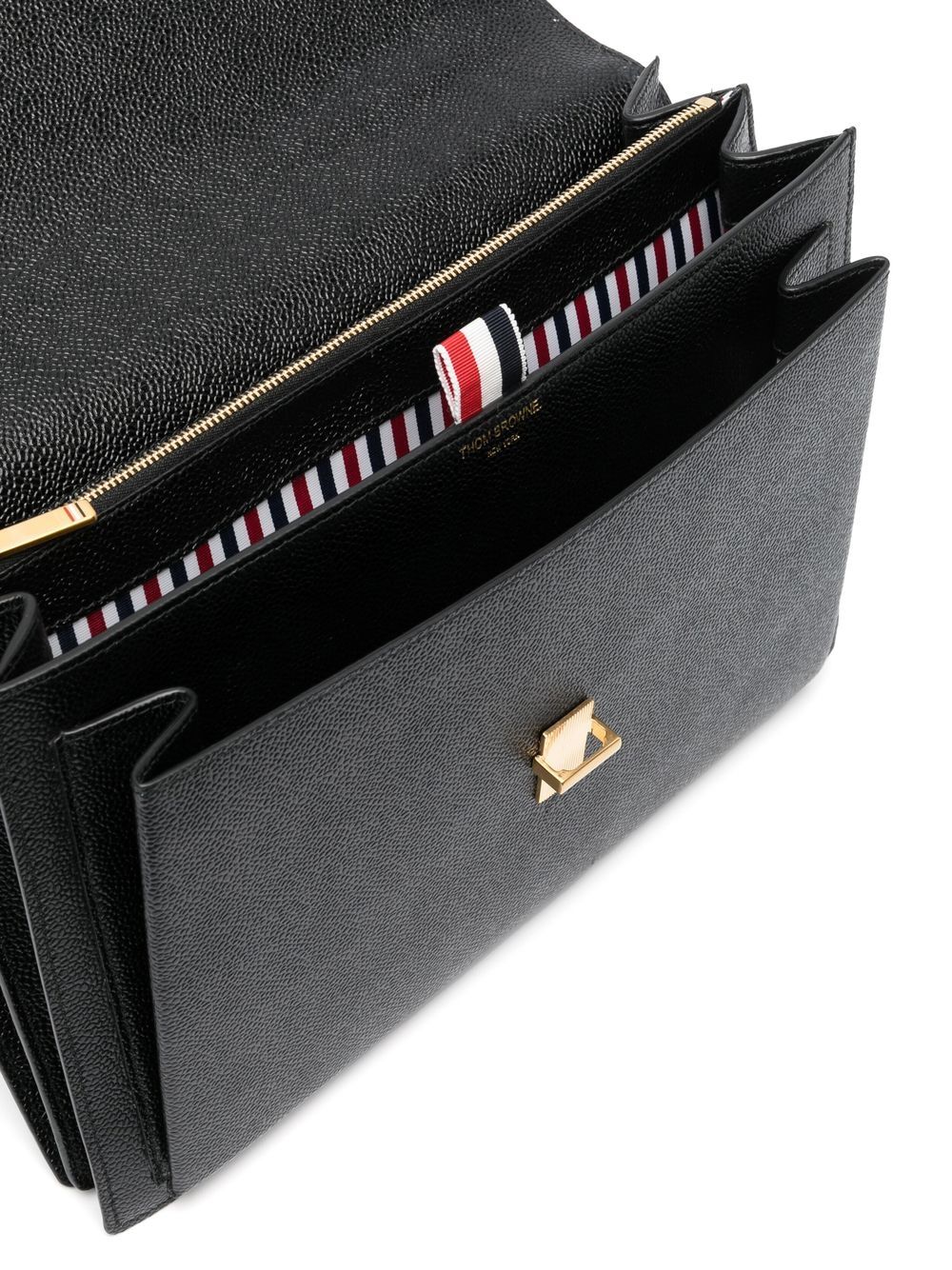 black calf leather grained texture adjustable detachable shoulder strap single rounded top handle flap-buckle fastening partitioned compartment signature Web-stripe trim