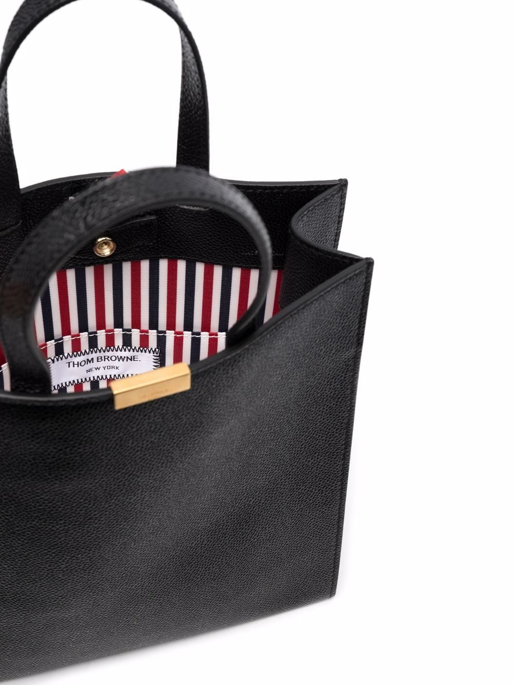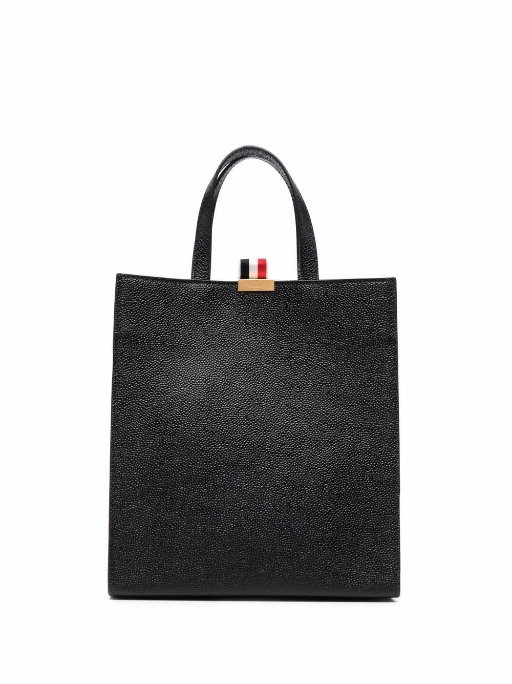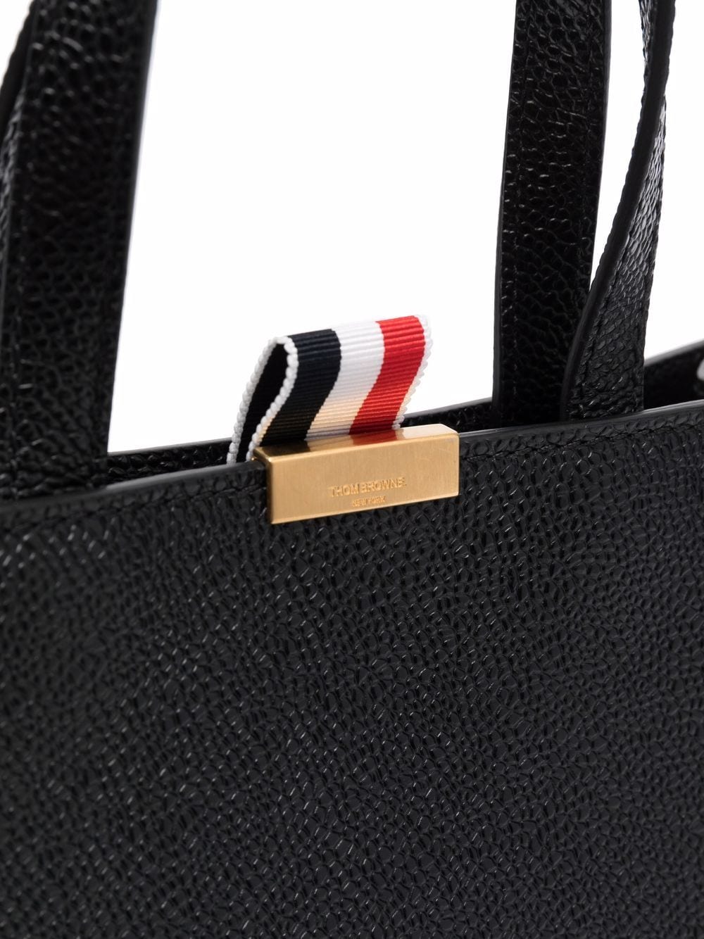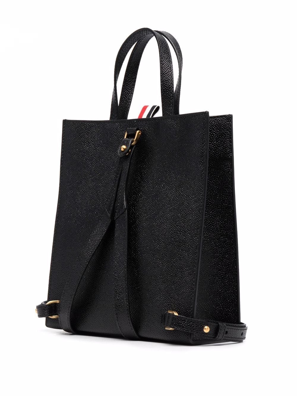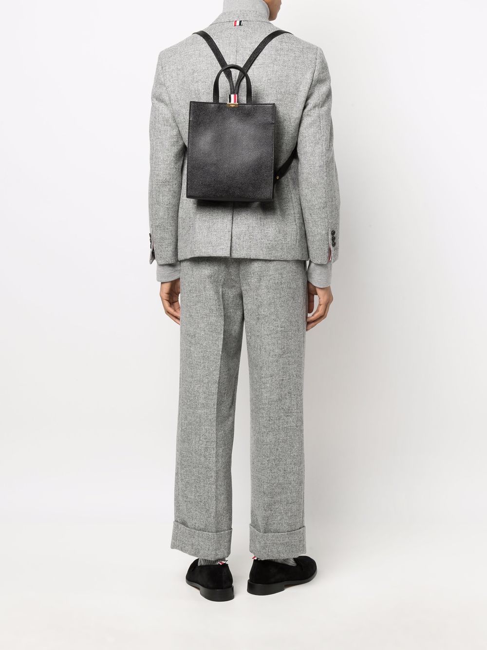 Designed with structure in mind, this black pebbled leather small backpack from Thom Browne has been fabricated in Italy from long-lasting and durable leather. Complimented by branded gold-tone hardware, the versatile silhouette benefits from a dual carry option in the form of rounded top handles and adjustable shoulder straps.