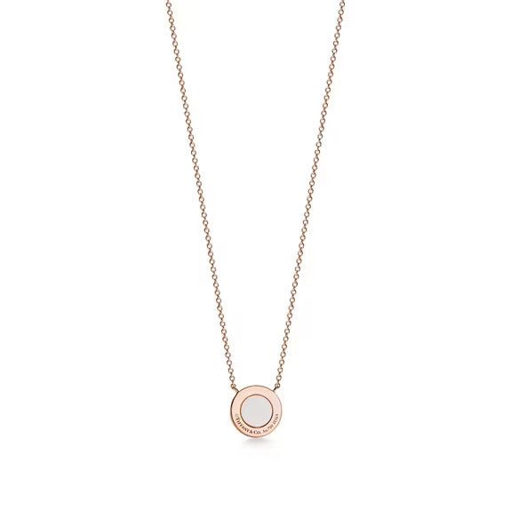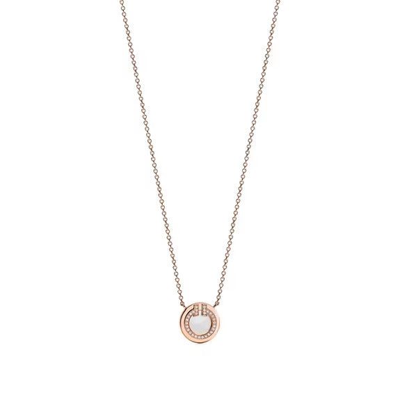 This circle pendant features mother-of-pearl, a natural, iridescent material found in oyster shells. The luminous pendant is traced with scintillating diamonds, resulting in a modern design with high shine and elegant luster. As multifaceted as it is iconic, the Tiffany T collection is a tangible reminder of the connections we feel but can't always see. Showcase your personal style by pairing this pendant with other Tiffany designs for a bold look.