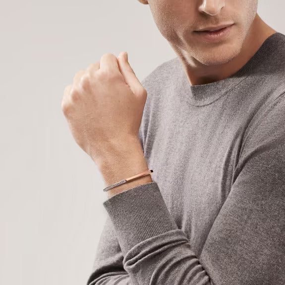 No rules. All welcome. Inspired by the power of togetherness and inclusivity, Tiffany Lock is a bold and visual statement about the personal bonds that make us who we are. Designed to be worn by all genders, the Tiffany Lock bangle features an innovative clasp that echoes the functionality of a padlock, an important motif from The Tiffany Archives. This style is expertly crafted in 18k rose gold with hand-set diamonds for a striking contrast.
