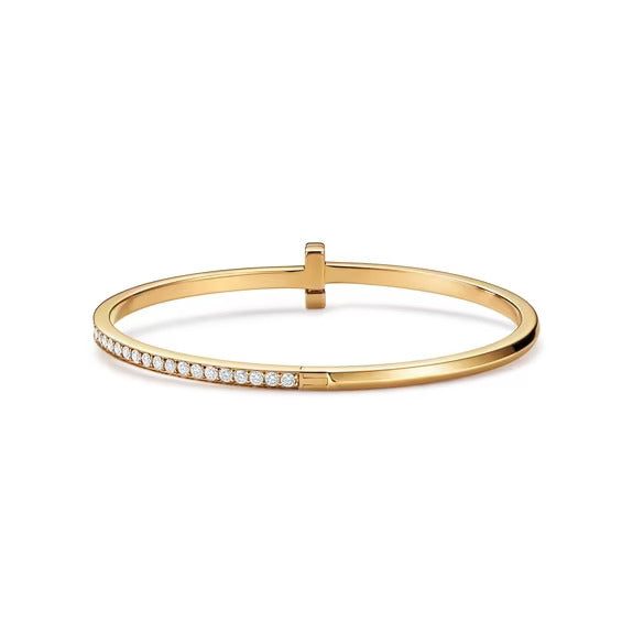 Wrapped around the wearer in a continuous, unbroken circle, this hinged bangle features scintillating diamonds and a strong "T" motif at the center. A reinvention of a Tiffany icon, Tiffany T1 designs represent individual strength and perpetual power, worn outwardly to express what lies within. Stack this hinged bangle with other Tiffany T bracelets for a bold look, or simply wear it on its own.