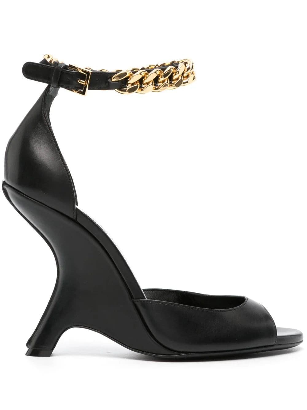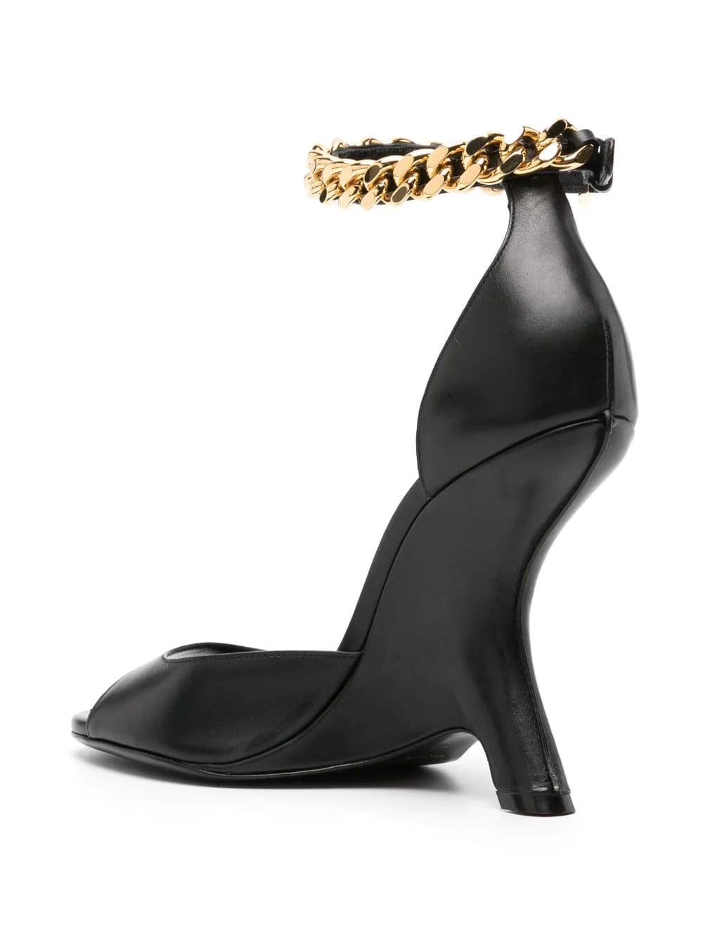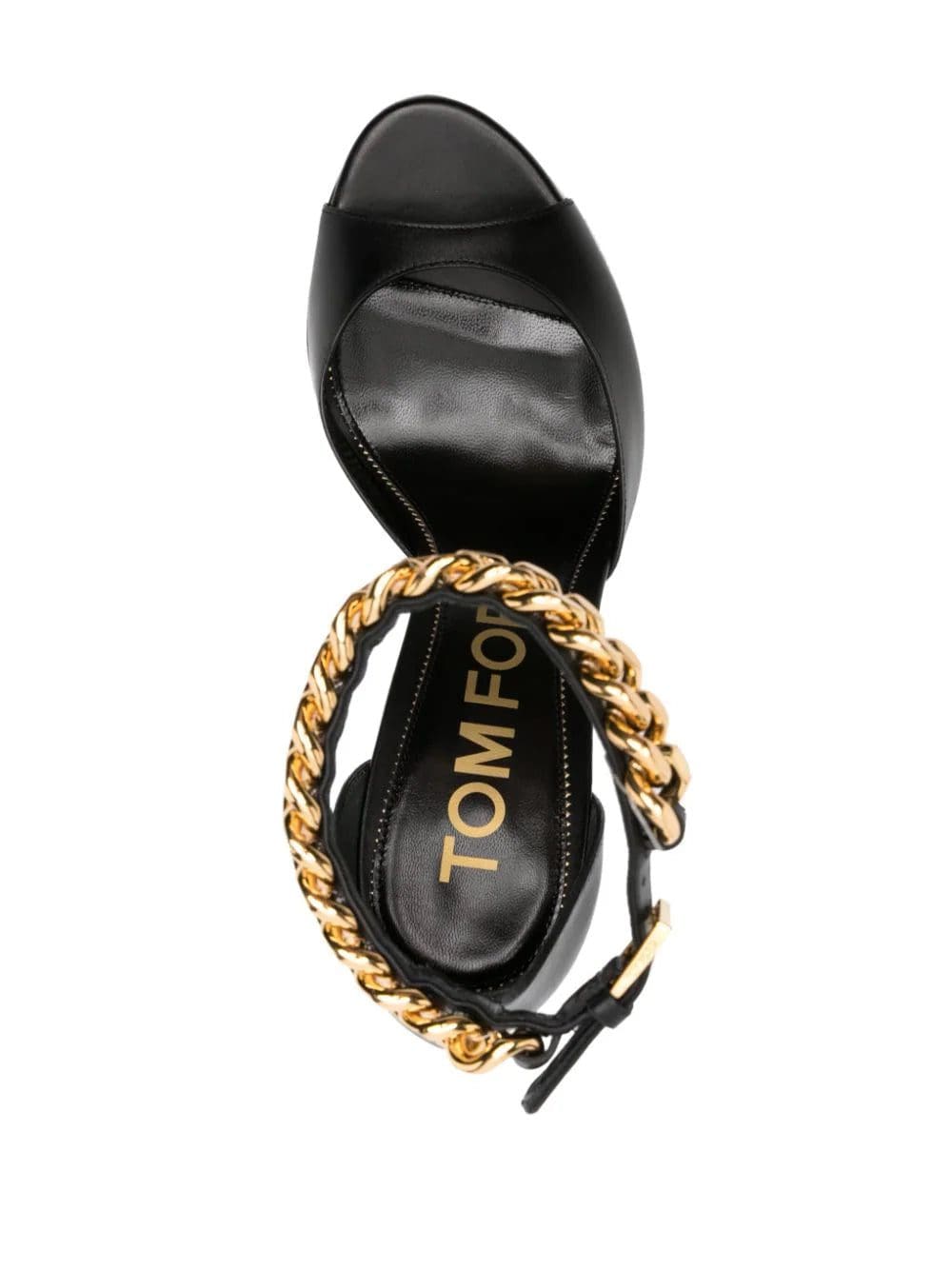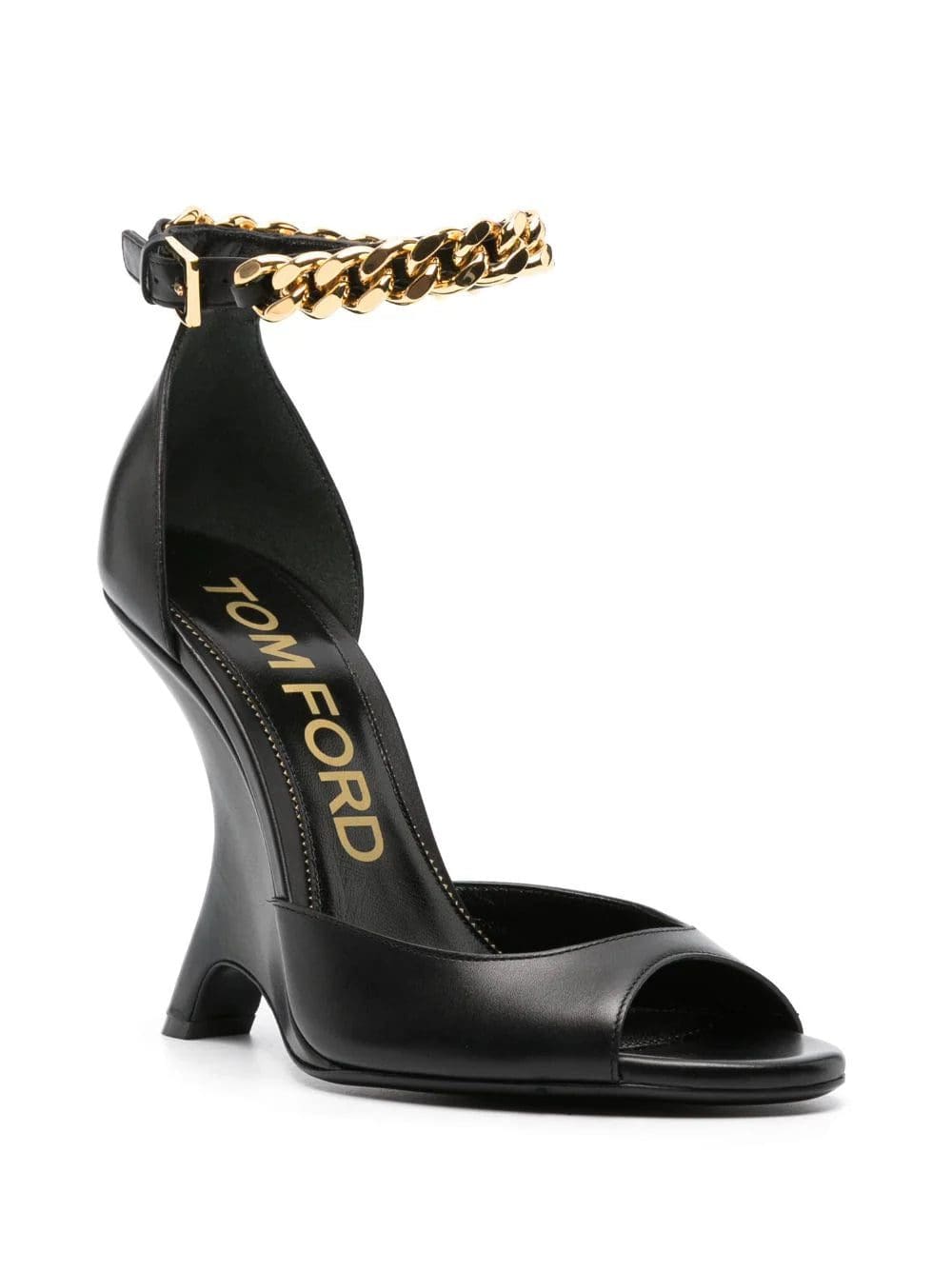 Building on its lineup of statement accessories, Tom Ford carves these black sandals from smooth calf leather to a sculptural silhouette grounded on a curved wedge heel. Meanwhile, a gold-tone gourmette chain on the ankle strap adds shine, in line with the maison's preference for hard-edged details.