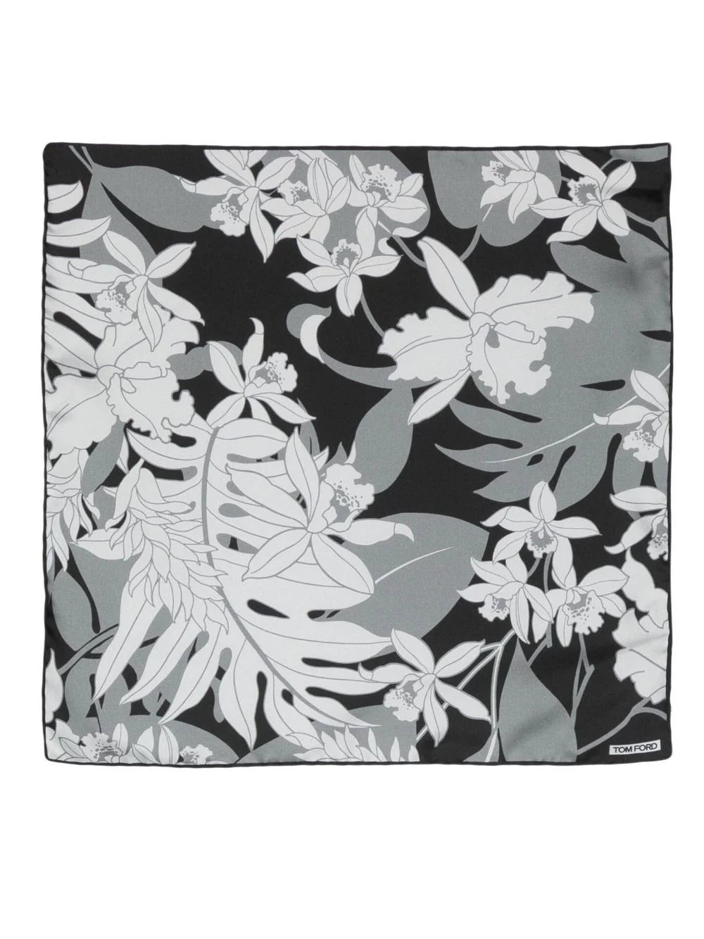 floral-print square silk scarf from TOM FORD featuring black, silk, all-over floral print, solid border and square frame.