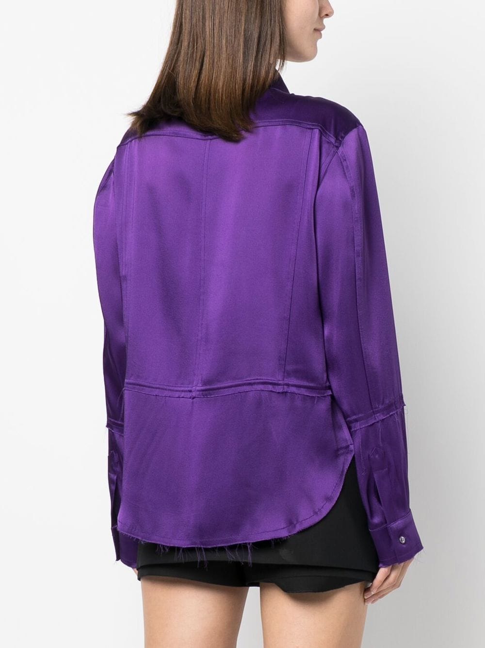 long-sleeve button-up shirt from TOM FORD featuring satin finish, classic collar, front button fastening, long sleeves, two chest flap pockets, curved hem and purple dahlia.