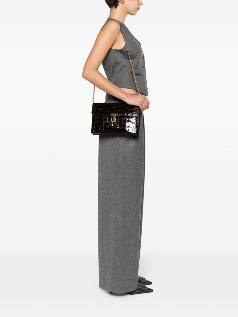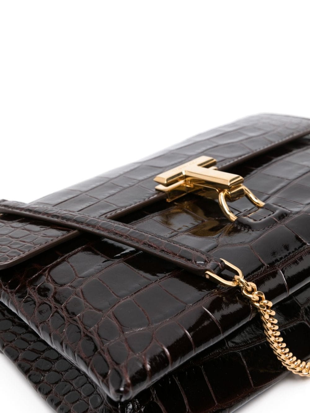 TOM FORD’s Monarch bag is crafted from glossy dark-brown leather embossed with realistic crocodile scales. The gold-tone T hardware at the front acts as the clasp fastening in both branded and functional detail.