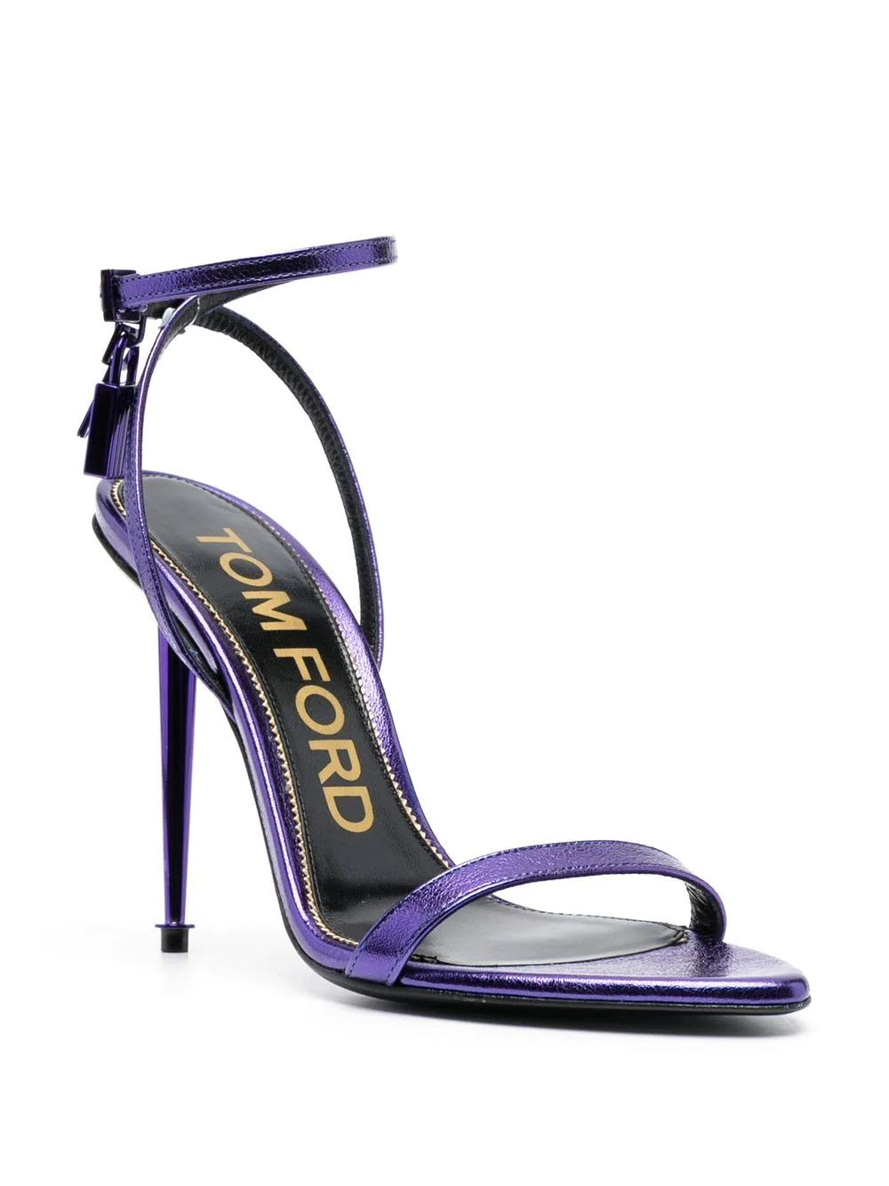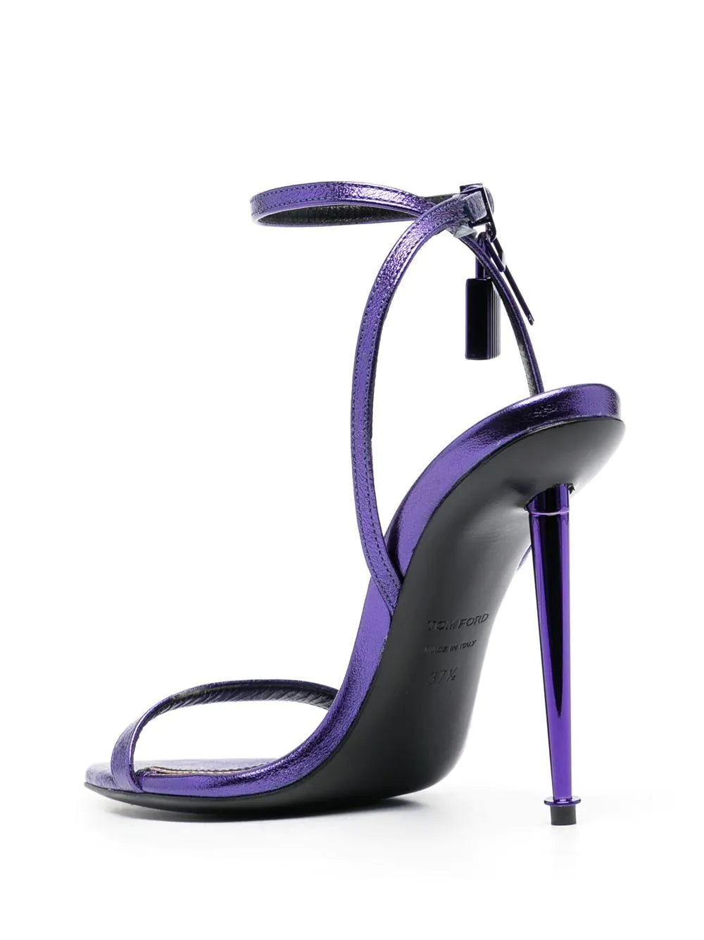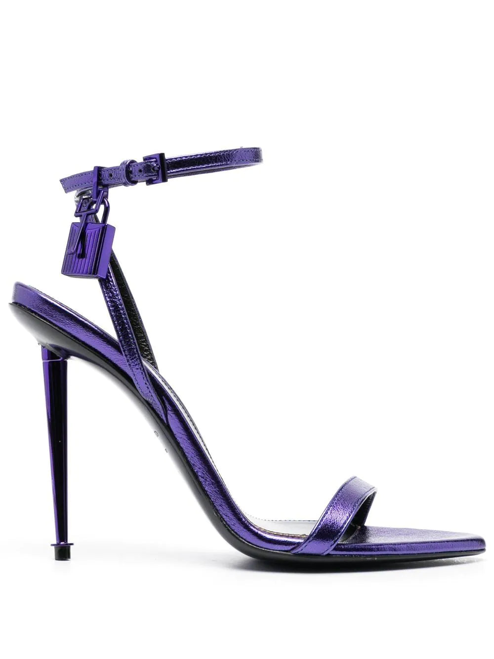 TOM FORD's padlock collection is defined by the padlock detail that adorns its footwear. Here, the brand's naked sandals are showcased with a metallic leather construction in a rich purple hue.