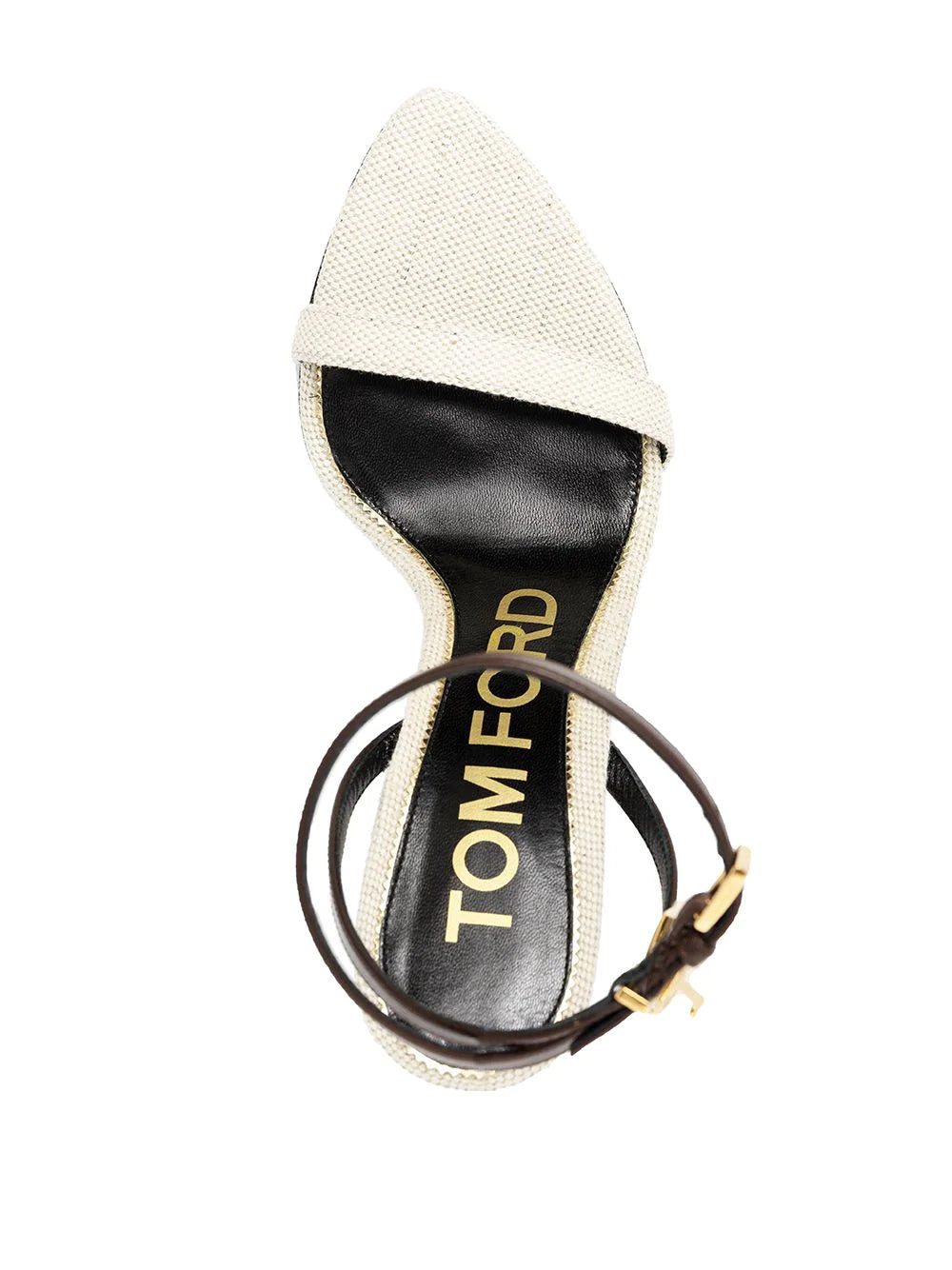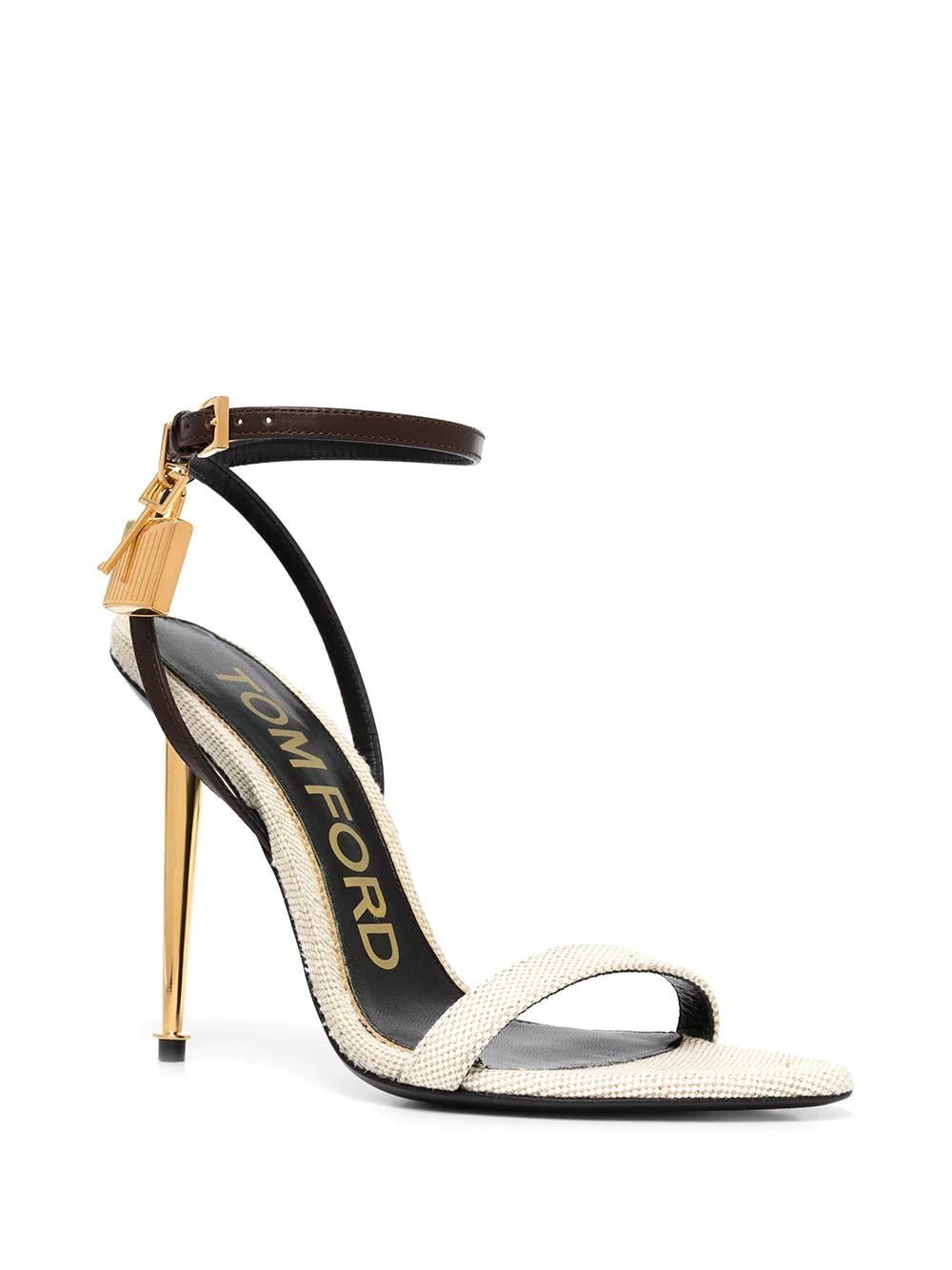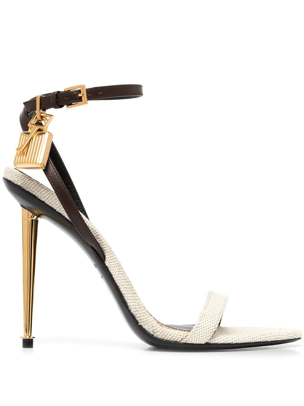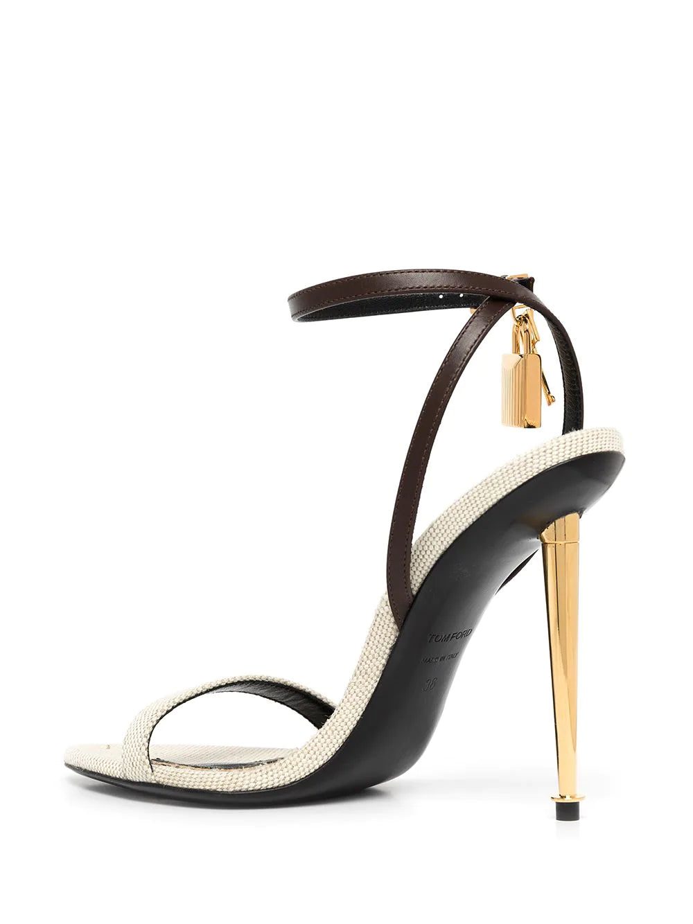 The slender wrap silhouette of Tom Ford's sandals creates a barely-there shape. Made in Italy from canvas and leather, the pair is finished with a gold-tone stiletto heel and padlock for an elevated feel.
