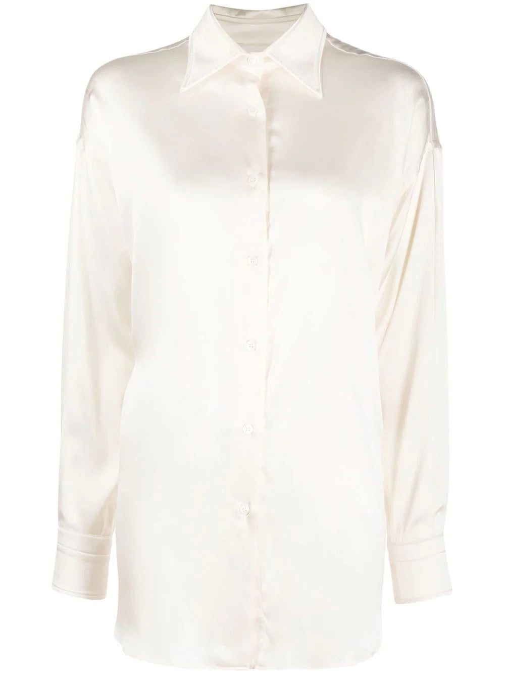 pointed-collar long-sleeved shirt from TOM FORD featuring white, silk, lyocell blend, straight-point collar, front button fastening, long sleeves, buttoned cuffs and curved hem.