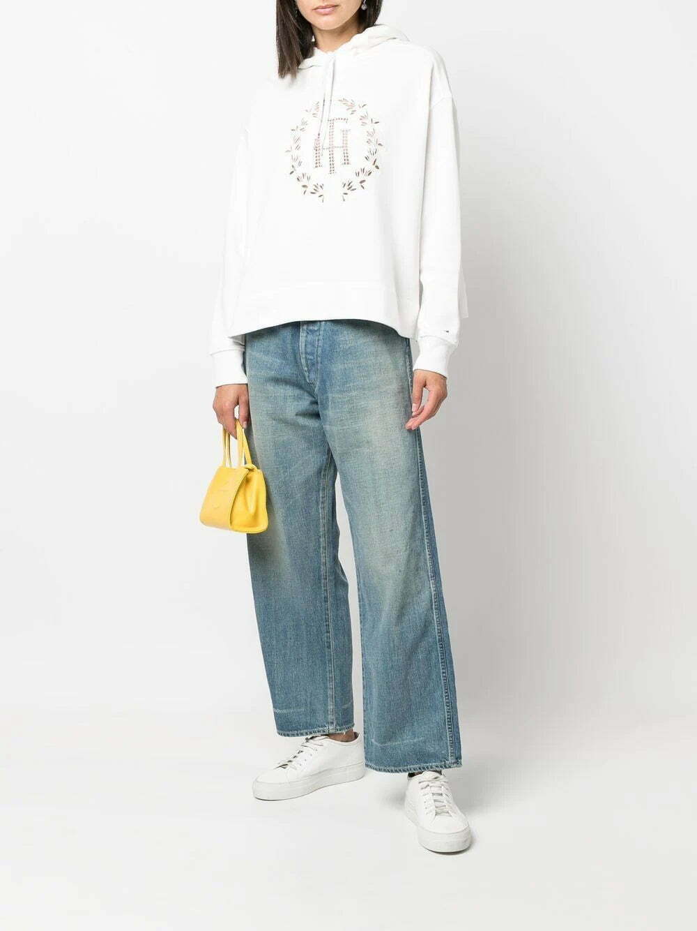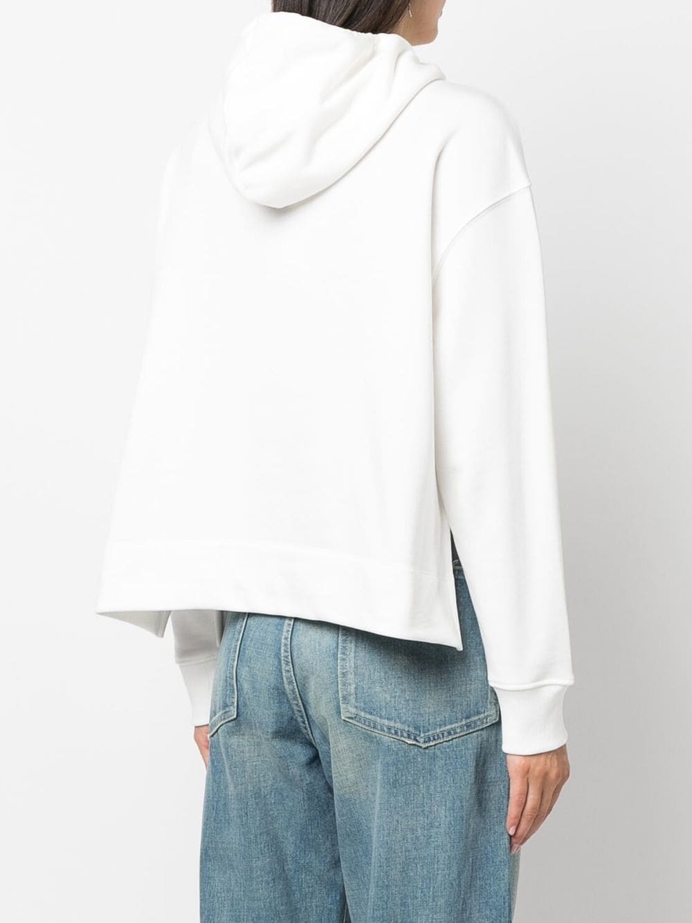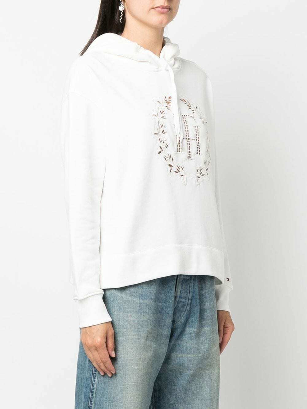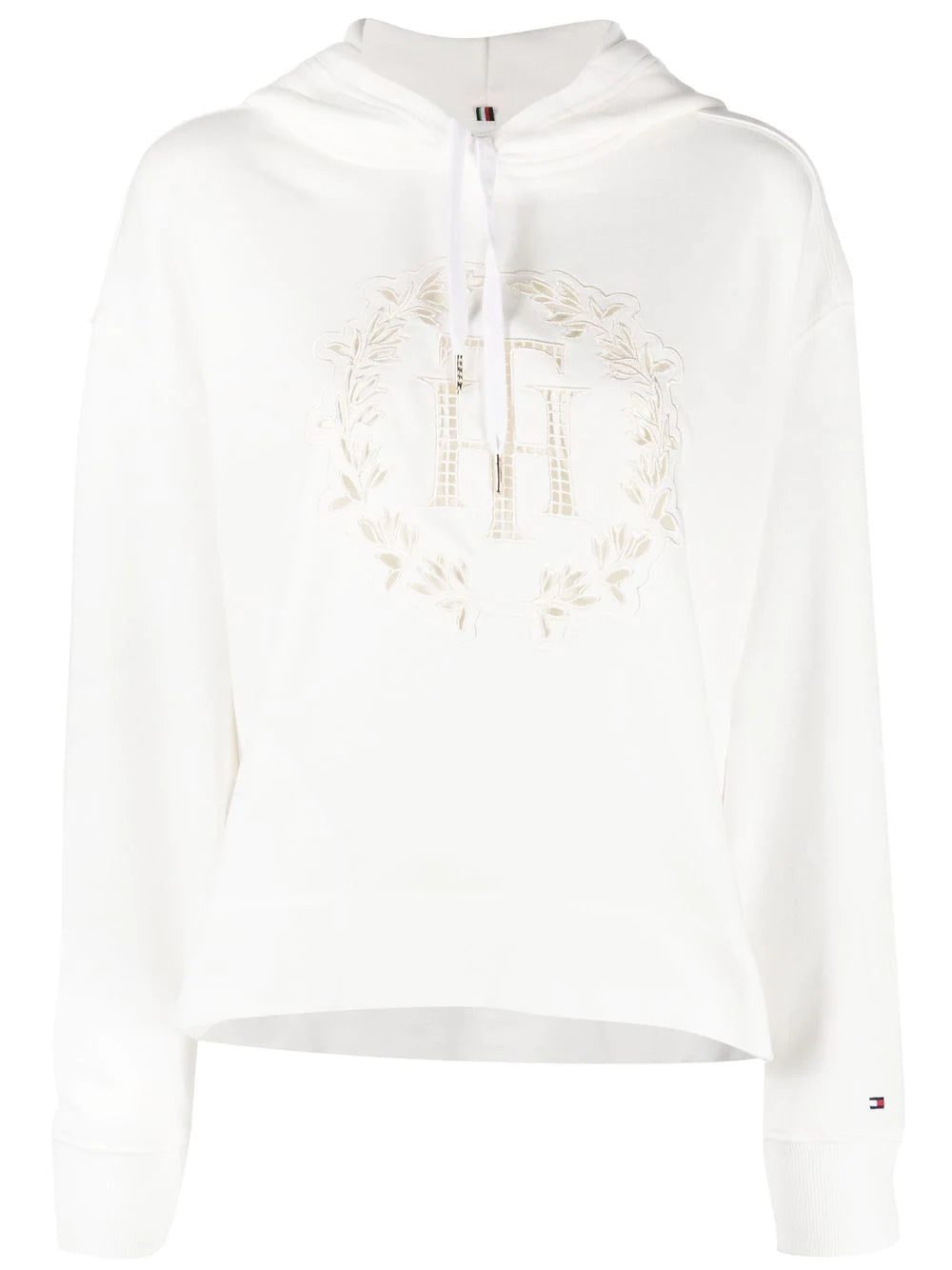 laser-cut logo drawstring hoodie from TOMMY HILFIGER featuring white, organic cotton, pullover design, drawstring hood, long sleeves, straight hem and laser-cut detail.