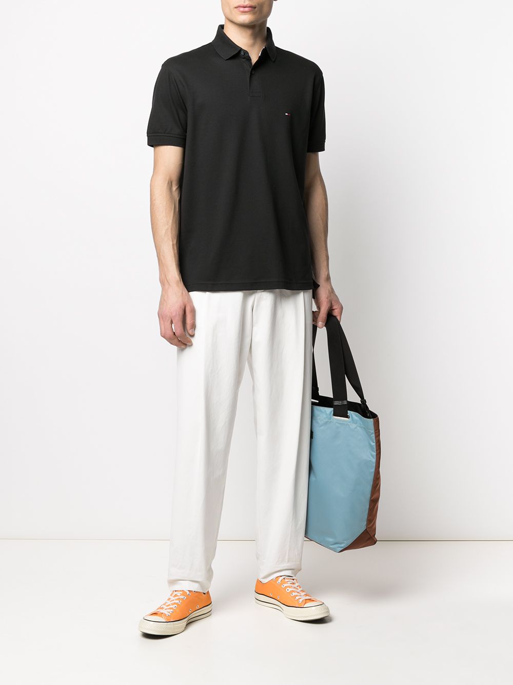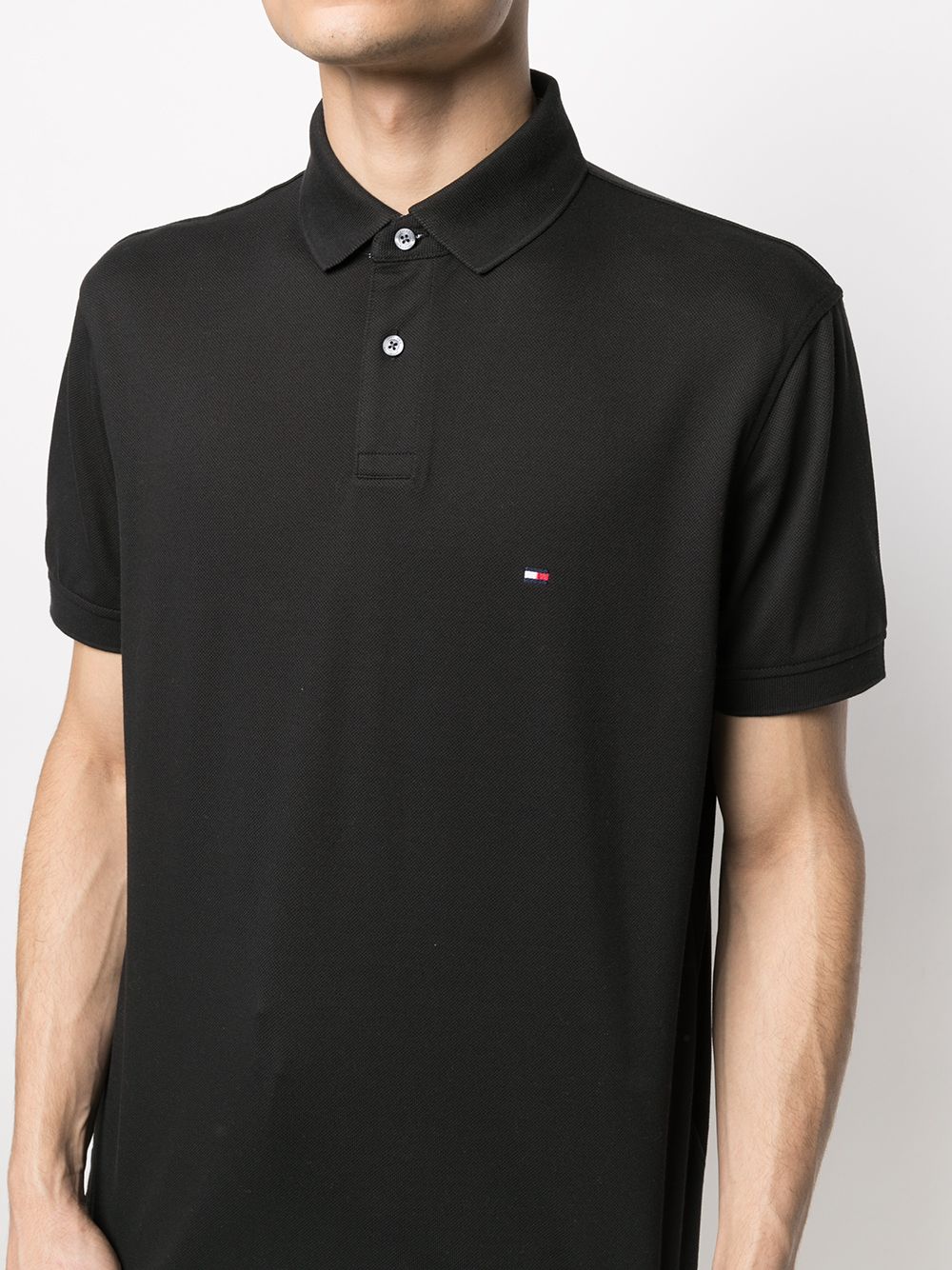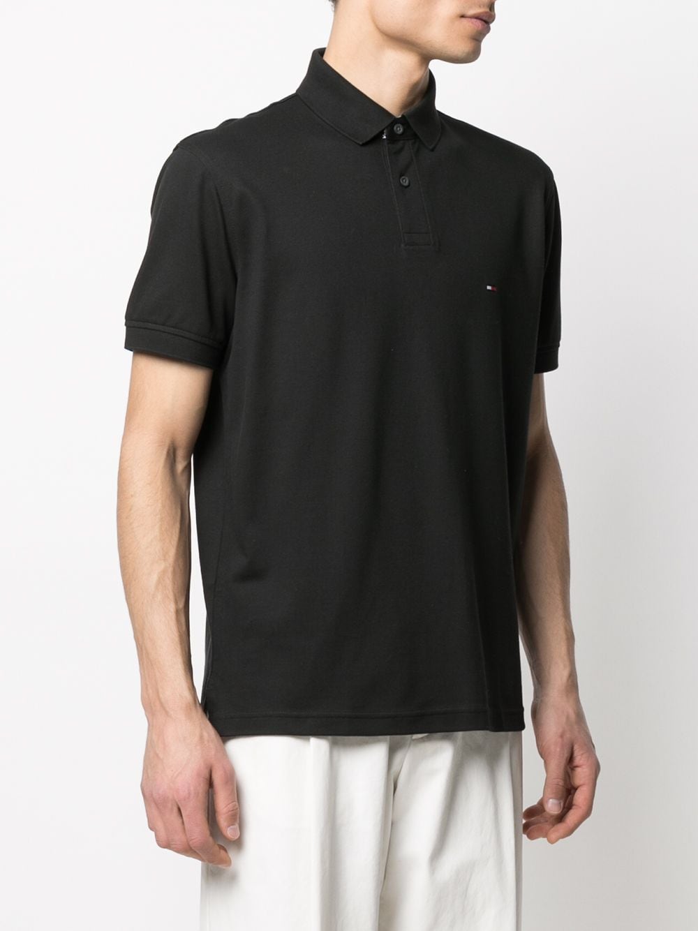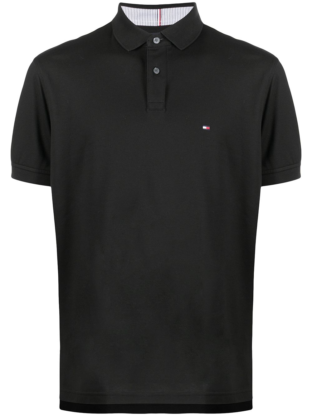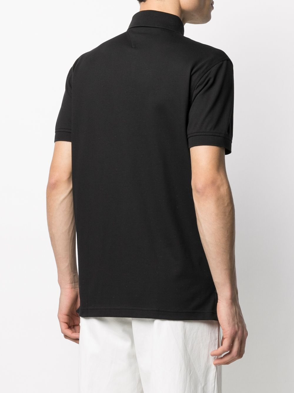 black cotton polo collar logo patch to the front front button placket short sleeves straight hem