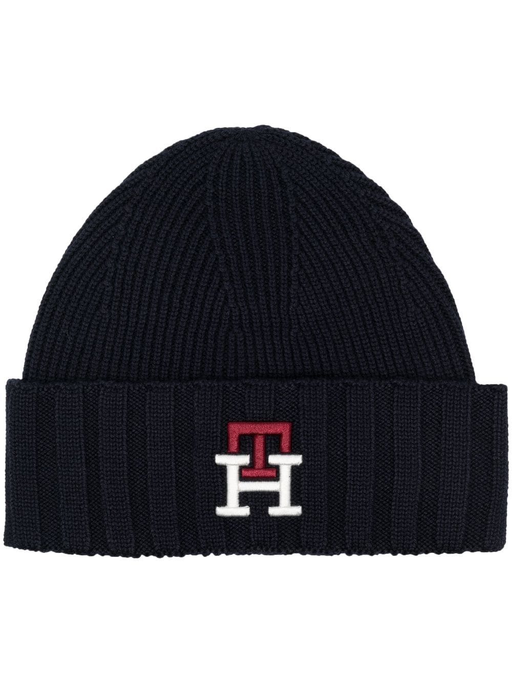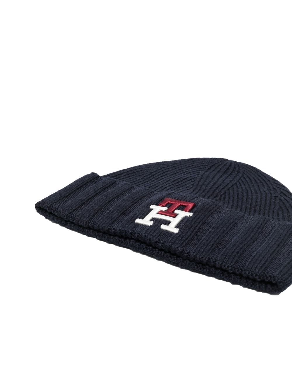 blue wool blend chunky ribbed knit logo patch to the front turn-up brim