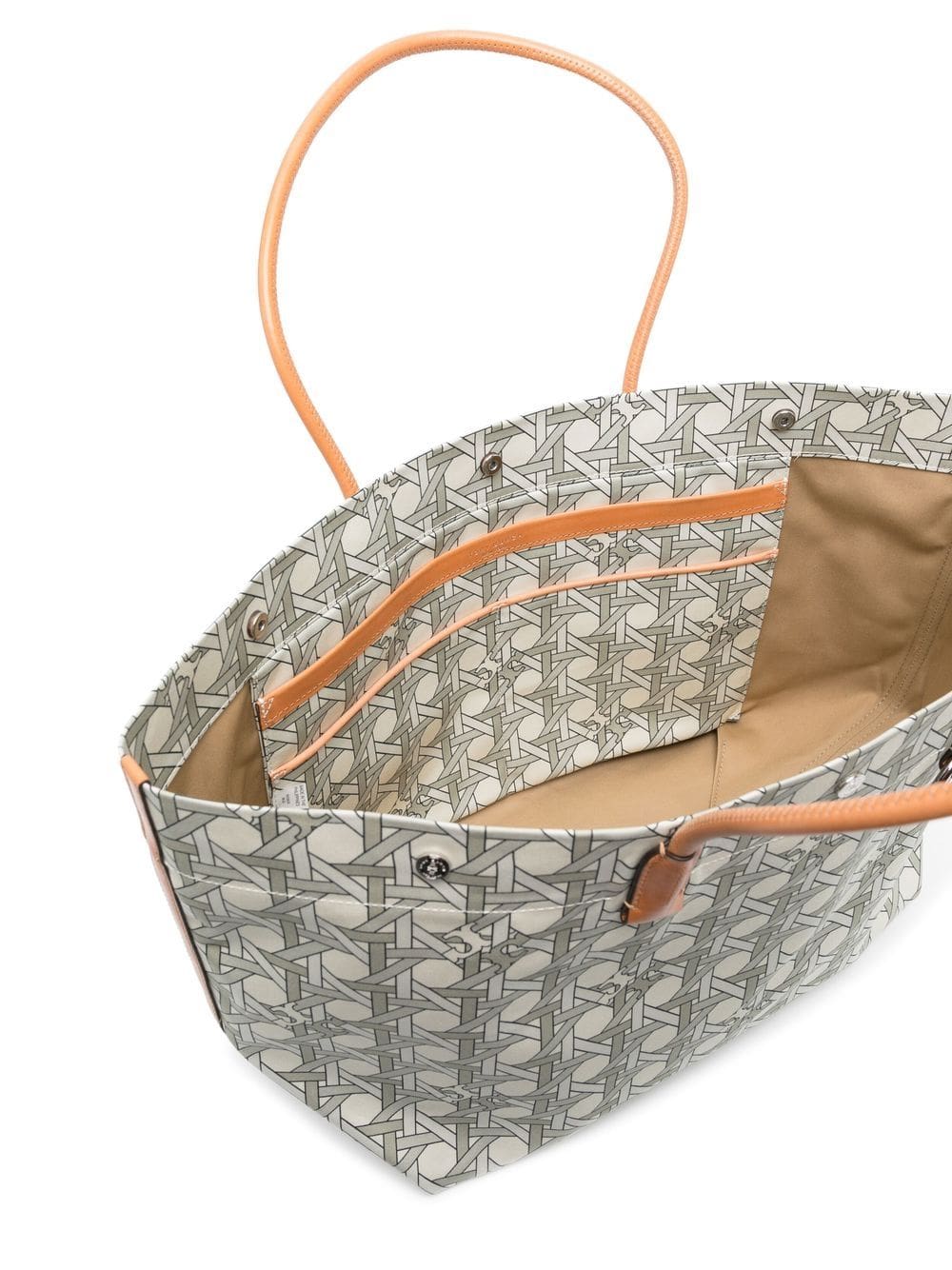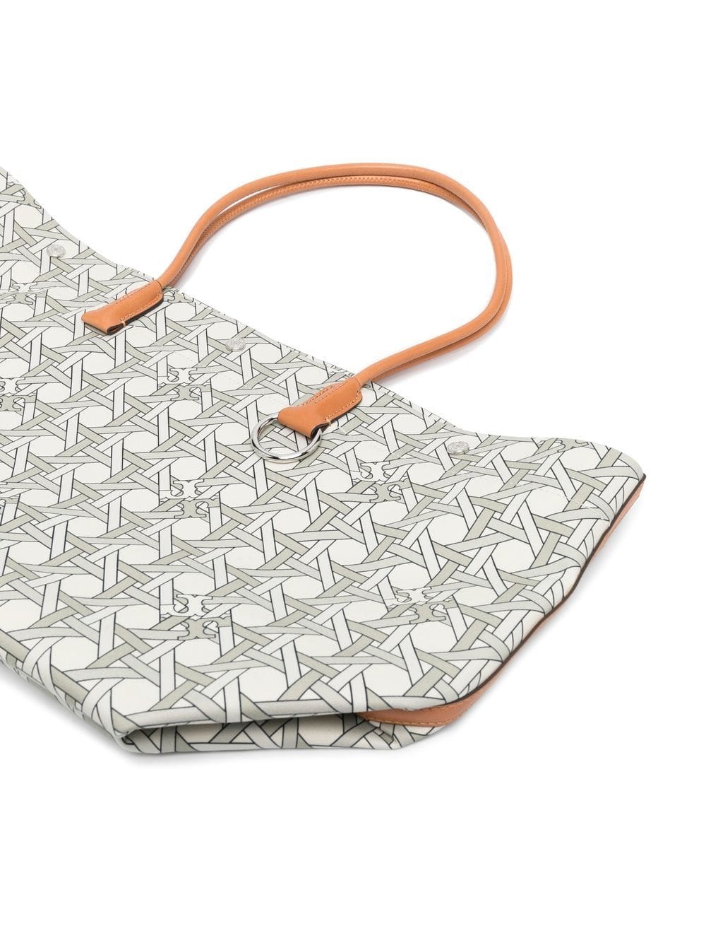 ivory white/brown cotton canvas signature basketweave print ring hardware detailing two top handles concealed press-stud fastening main compartment