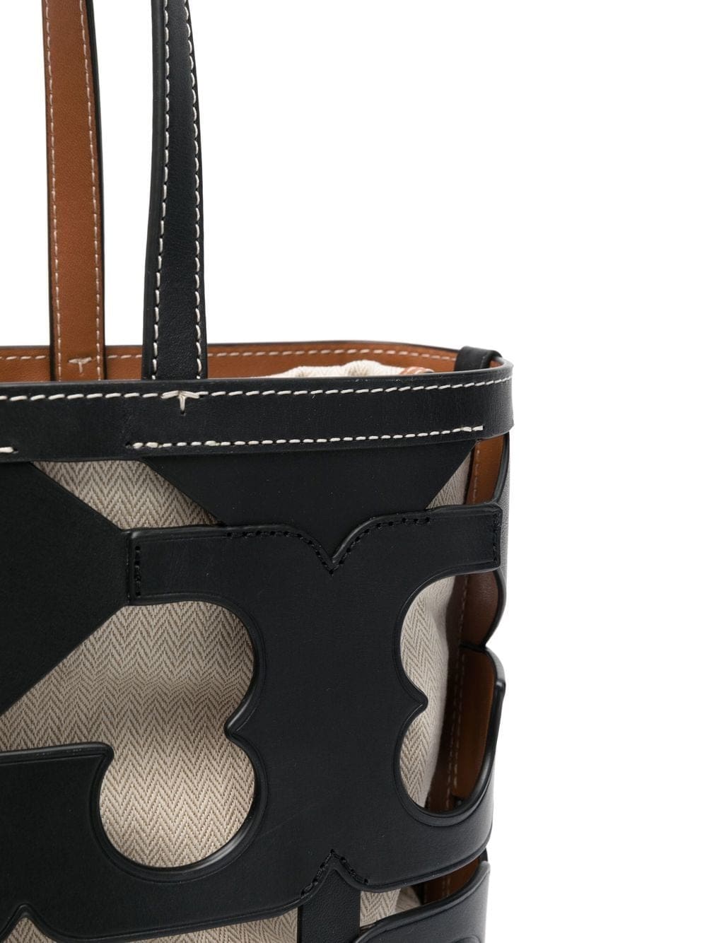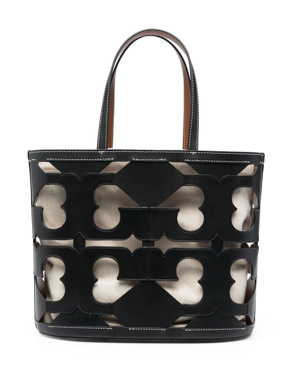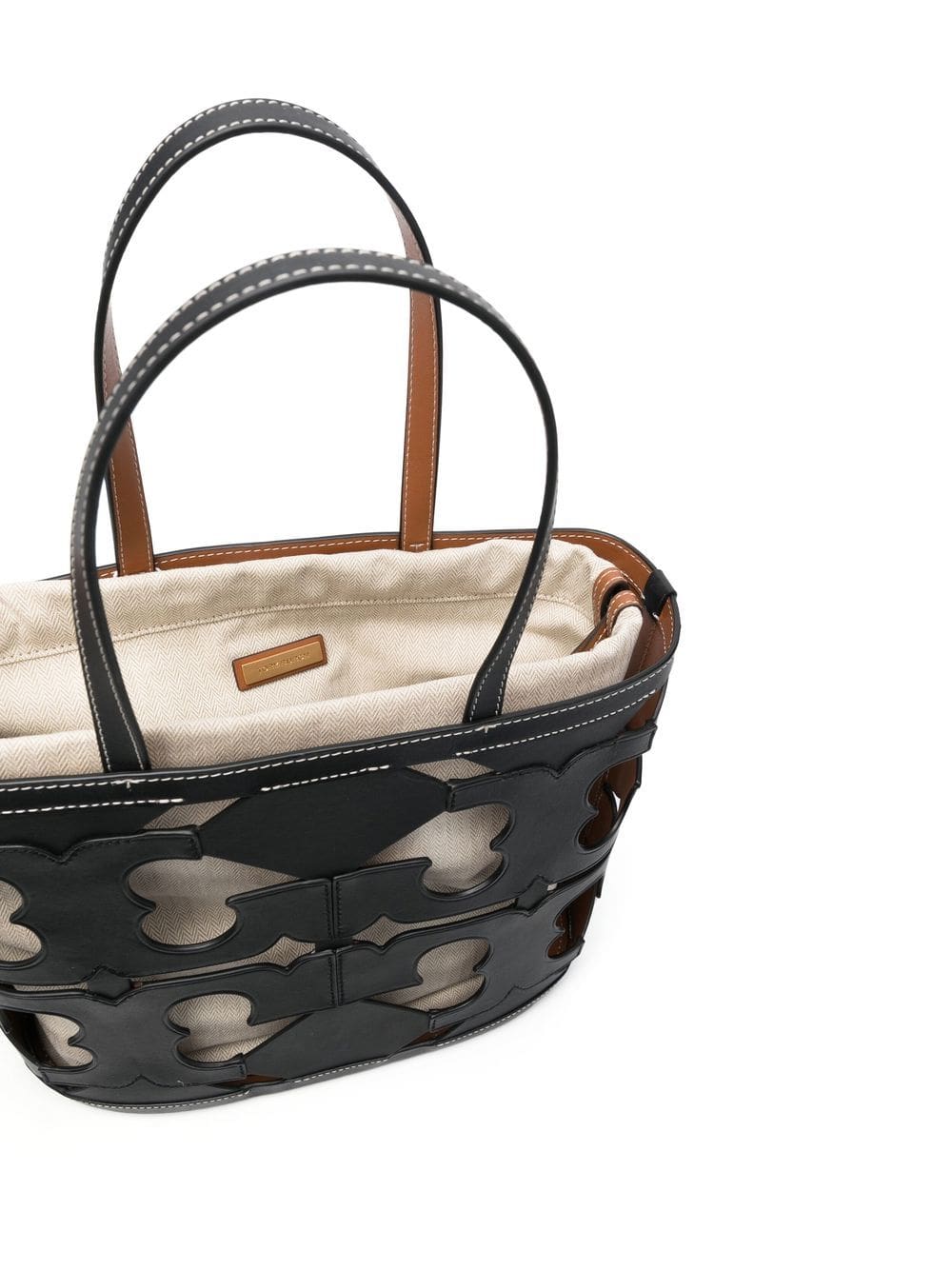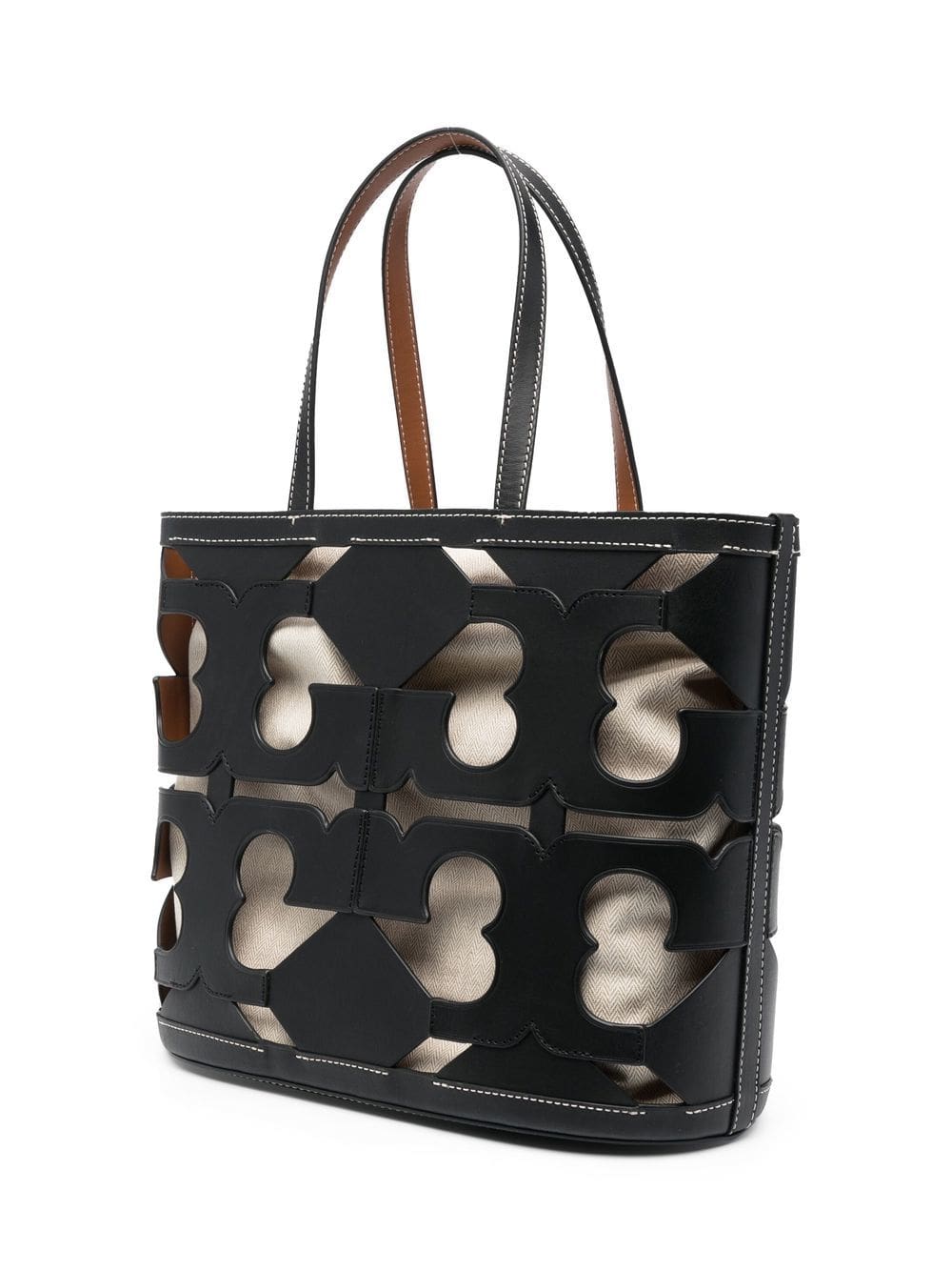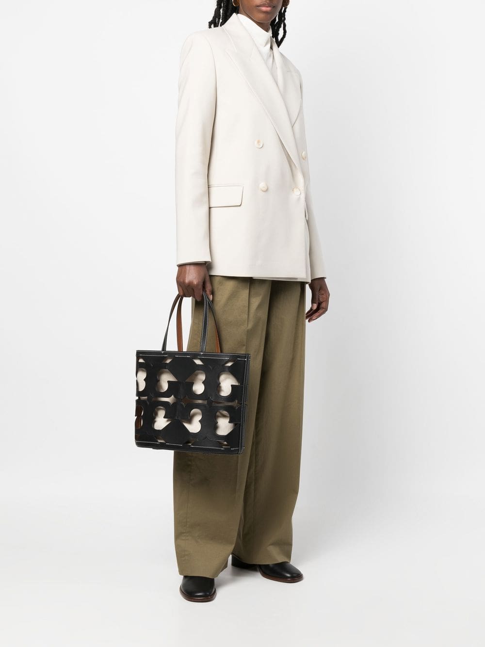black calf leather cut-out logo detailing laser-cut detail contrast stitching removable pouch two top handles main compartment